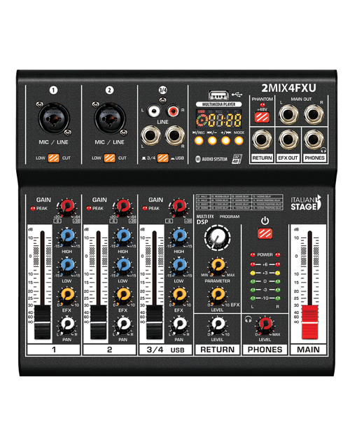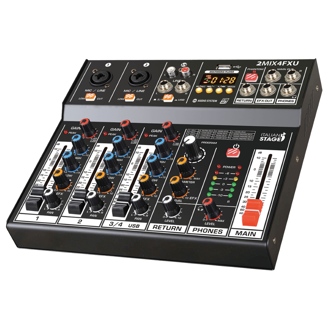 The Italian Stage 2MIX4FXU has everything you need from a small format mixer, at an affordable price. It features low noise preamps for clear and powerful sound, as well as a complete feature set that includes Bluetooth audio streaming, USB recording and playback, and a digital DSP Multi FX processor. The 2MIX4FXU also works as a 2 + 2 channel USB audio interface for DAW recording / playback.
