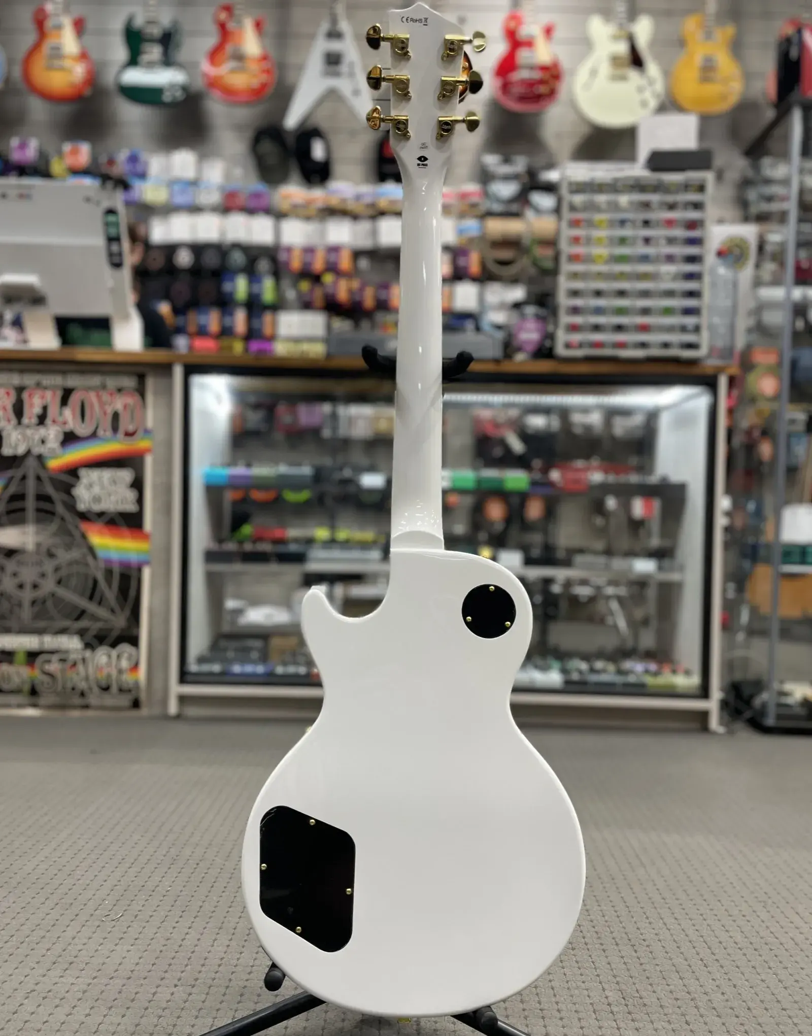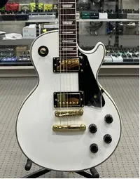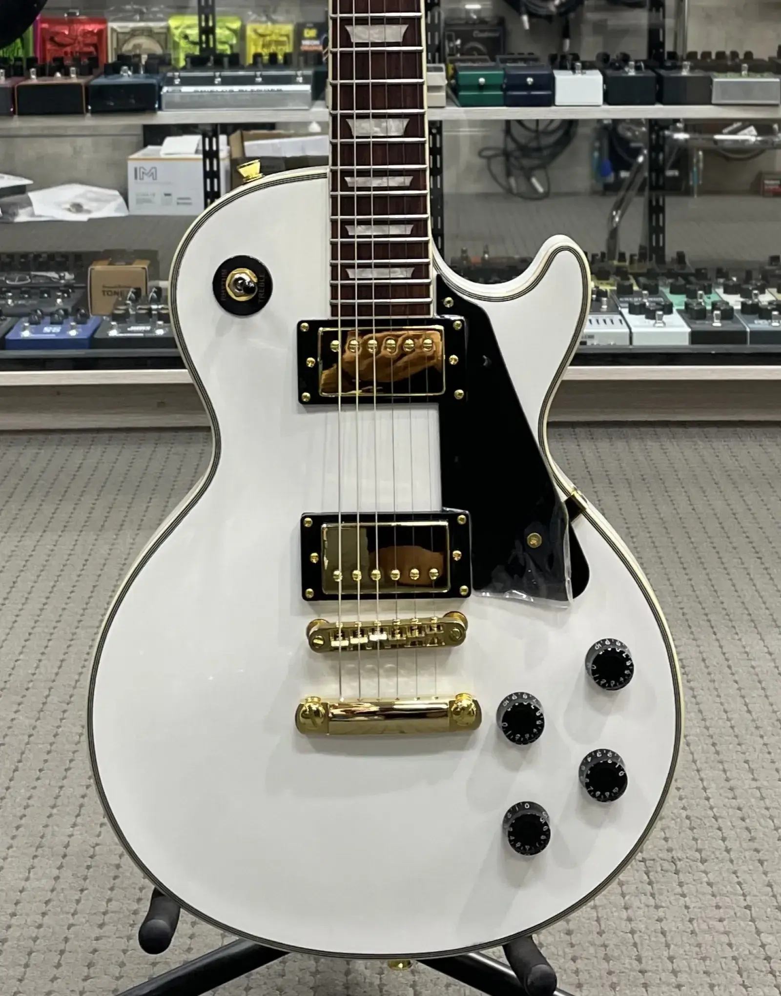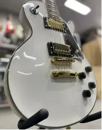 The JET Guitars JL-500 Custom Electric Guitar RW, finished in Arctic White, features two alnico humbuckers, for classic thick Les Paul tone, perfect for everything from jazzy licks to high-gain riffs. Premium features not usually found in guitars this affordable, like a thick Mahogany body, Modern C-Profile Mahogany set neck, gold hardware, and Rosewood fingerboard, make for hours of easy and comfortable playability.