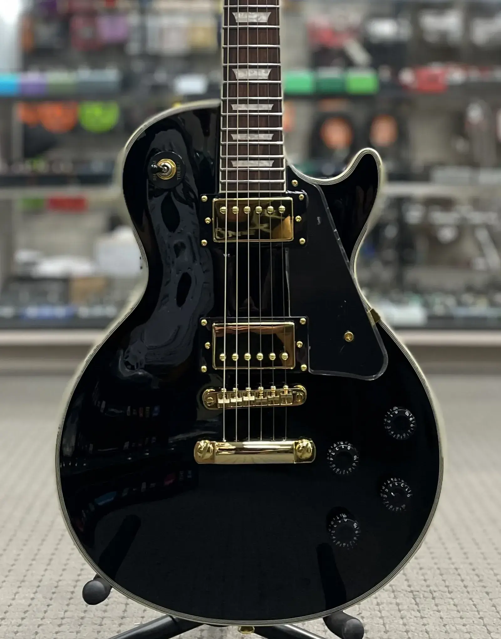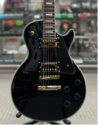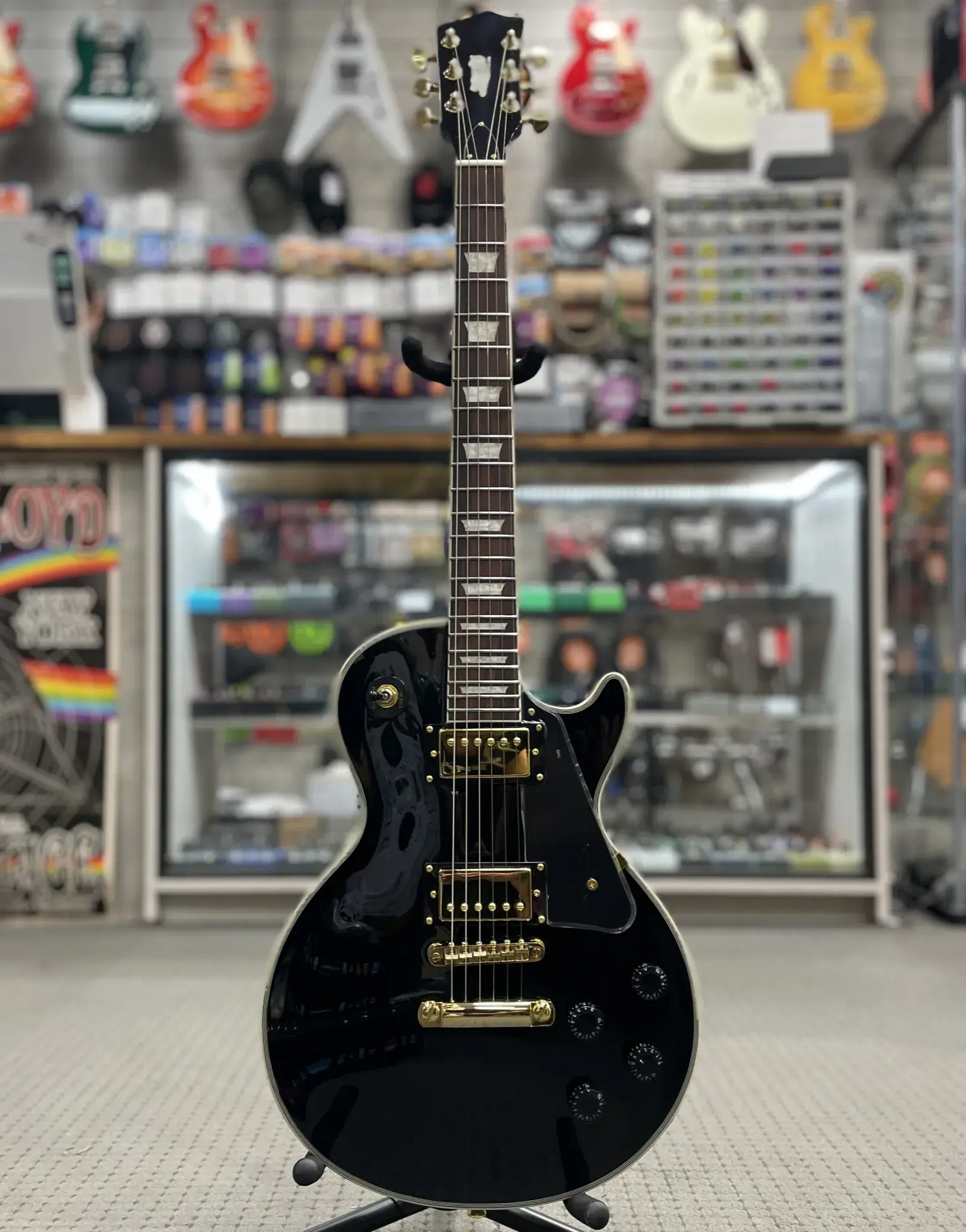 The JET Guitars JL-500 Custom Electric Guitar RW, finished in Black, features two alnico humbuckers, for classic thick Les Paul tone, perfect for everything from jazzy licks to high-gain riffs. Premium features not usually found in guitars this affordable, like a thick Mahogany body, Modern C-Profile Mahogany set neck, gold hardware, and Rosewood fingerboard, make for hours of easy and comfortable playability.