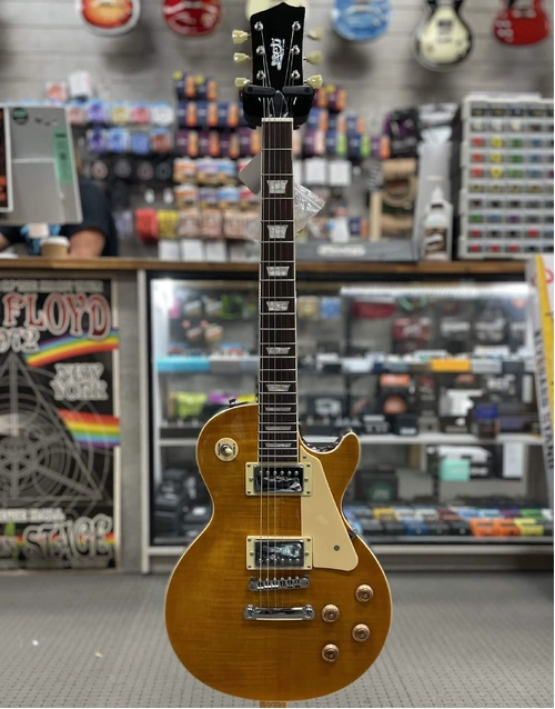 The JET Guitars JL-500 Electric Guitar RW, finished in Lemon Burst, features two alnico humbuckers, for classic thick Les Paul tone, perfect for everything from jazzy licks to high-gain riffs. Premium features not usually found in guitars this affordable, like a thick Mahogany body, Modern C-Profile Mahogany set neck, and Rosewood fingerboard, make for hours of easy and comfortable playability.