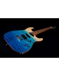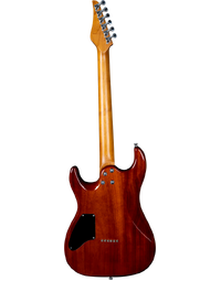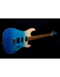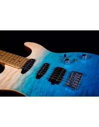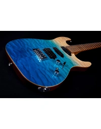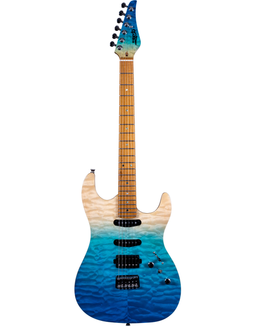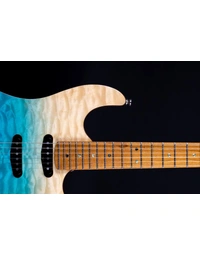 The JET Guitars JS-1000 Quilted Maple Top Electric Guitar HSS Roasted MN, finished in Transparent Blue, features the combination of two Alnico single-coils and a humbucker, all handwired and direct mounted, perfect for everything from smooth bell-like Strat tone, to gained up modern riffs. Premium features not usually found in guitars this affordable, like a Modern C-Profile Roasted Maple neck and fingerboard, make for hours of easy and comfortable playability. A Mahogany body with Quilt Maple top are not only excellent tone woods, but they look incredible with a Transparent Blue finish. Locking tuners and a fixed bridge ensure solid tuning stability.