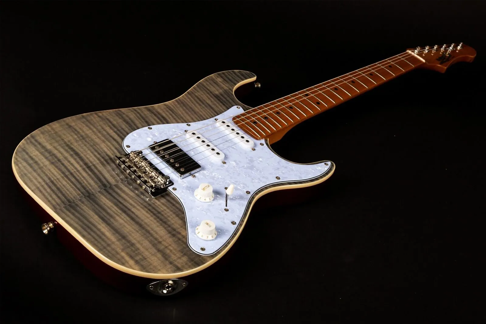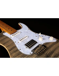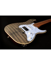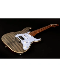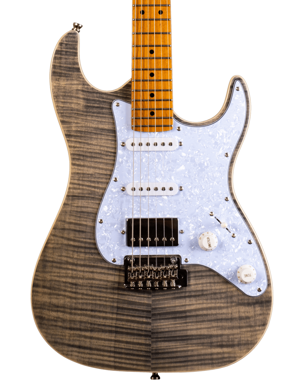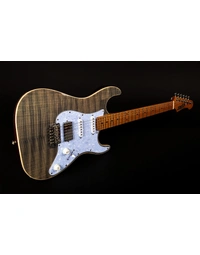 The Transparent Black finish on the JET Guitars JS-450 brings a sleek and modern look to this affordable beginner guitar. The Flamed Maple top adds depth to the appearance while the roasted maple neck and fingerboard ensure a comfortable playing experience. The HSS pickup configuration delivers a range of sounds from bright and crisp cleans to warm and full-bodied tones perfect for when you turn up the gain.