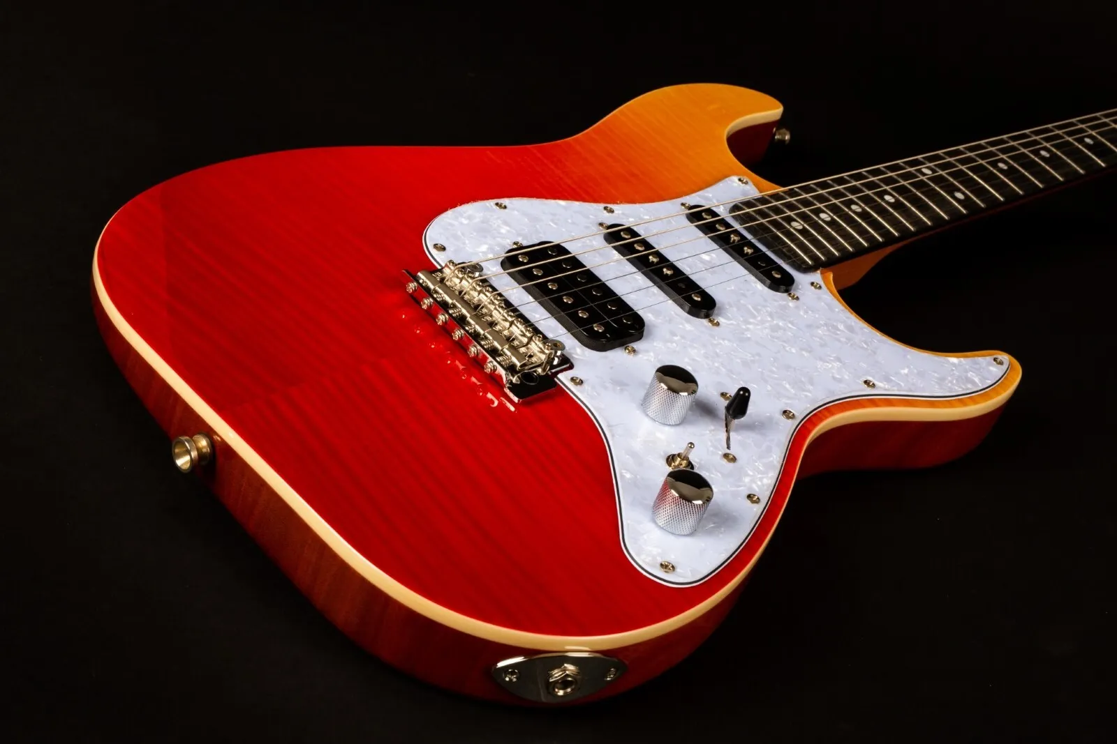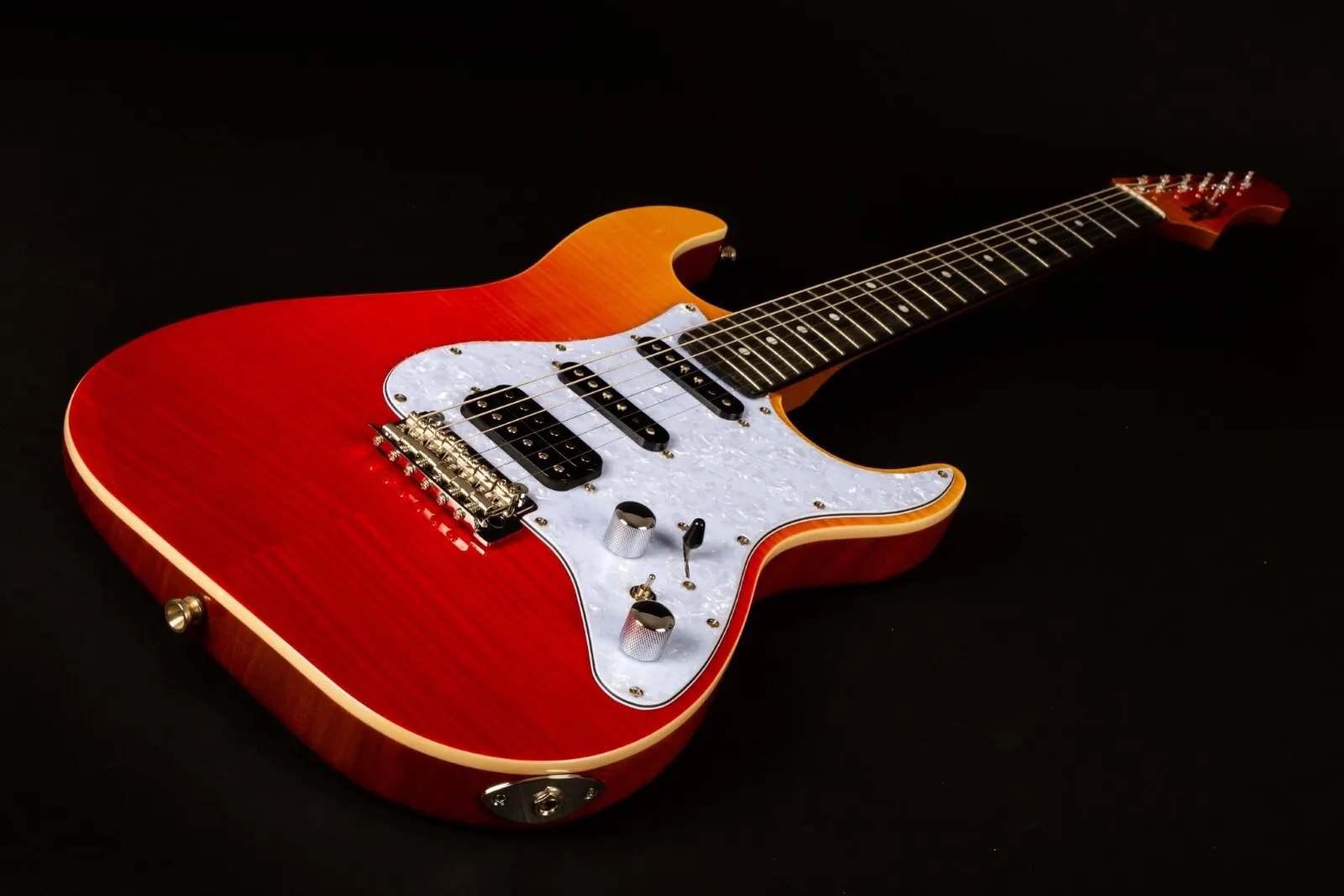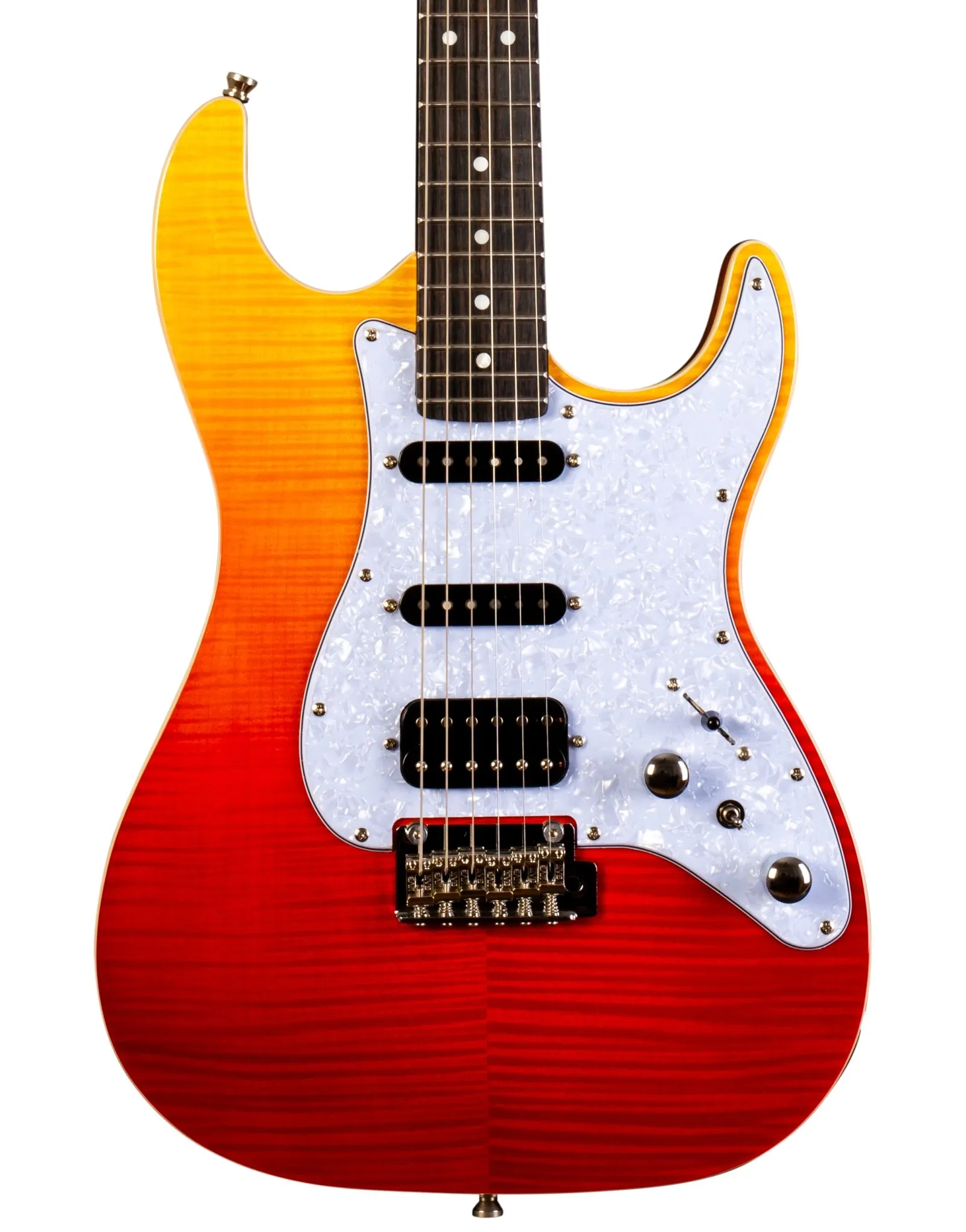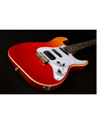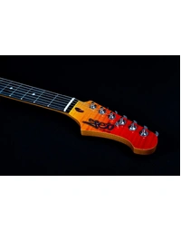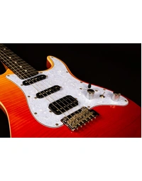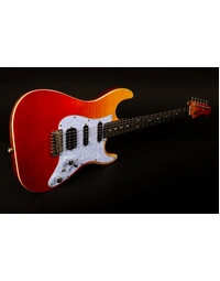 The JET Guitars JS-600 Flamed Maple Top Electric Guitar HSS EB, finished in Transparent Red, features the combination of two Alnico single-coils and a coil-splitting humbucker, perfect for everything from smooth bell-like Strat tone, to gained up modern riffs. Premium features not usually found in guitars this affordable, like a Modern C-Profile Roasted Maple neck and Ebony fingerboard, make for hours of easy and comfortable playability. A Mahogany body with Flamed Maple top are not only excellent tone woods, but they look incredible with a Sunburst finish. A tremolo takes care of all your whammy needs.