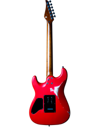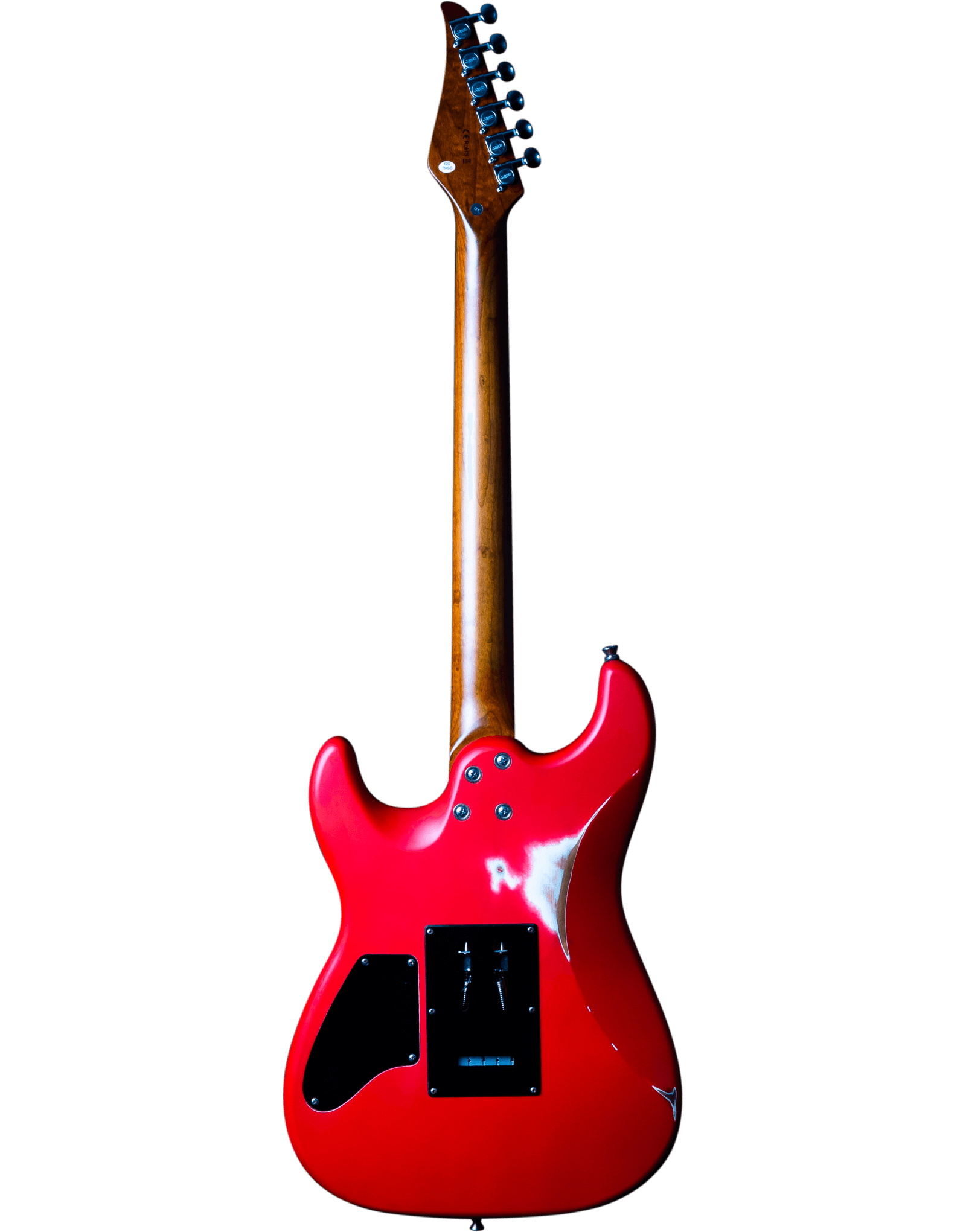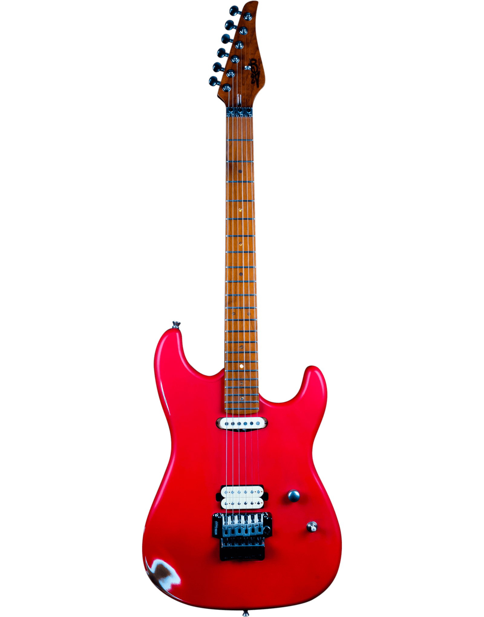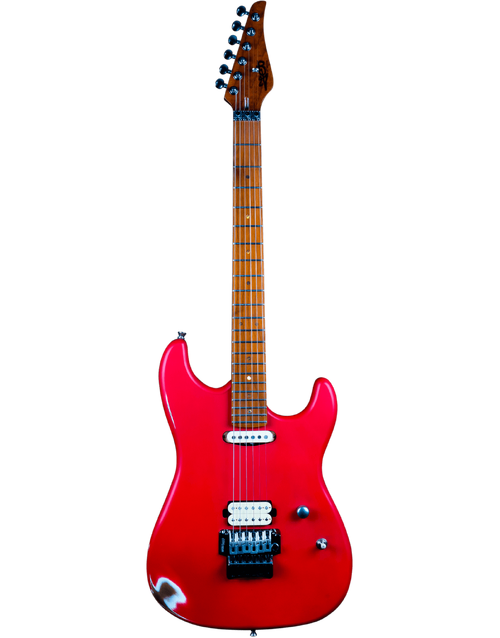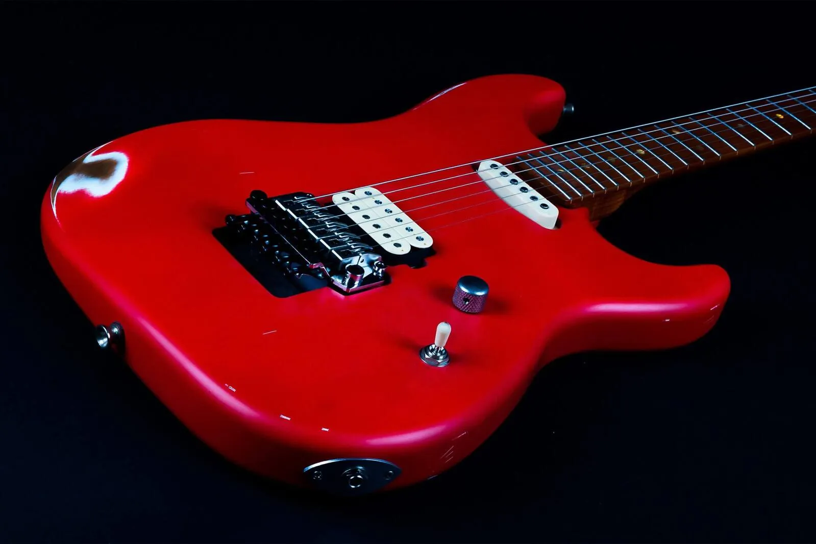 The JET Guitars JS-850 FR Relic Electric Guitar HS Roasted MN, finished in Red, features the combination of an Alnico single-coil and humbucker, both handwound and direct mounted, perfect for everything from smooth bell-like Strat tone, to gained up modern riffs. Premium features not usually found in guitars this affordable, like a Wilkinson Double Locking tremolo, an Alder body, and a Modern C-Profile Roasted Maple neck and fingerboard, make for hours of easy and comfortable playability. A relic finish and aged hardware gives this guitar the look of a played-in vintage instrument, and makes a nice feature of the tonewood's grain.