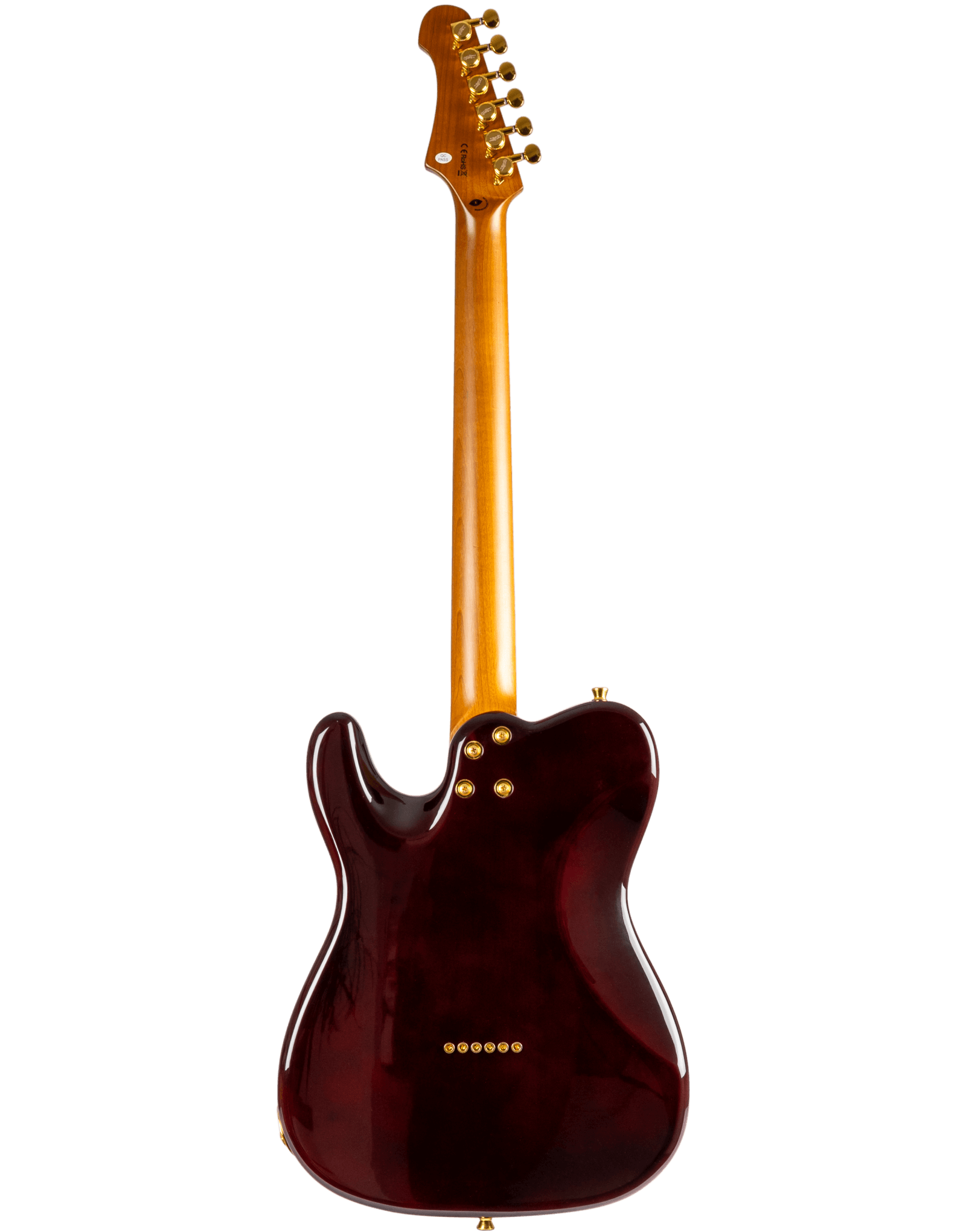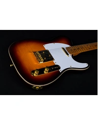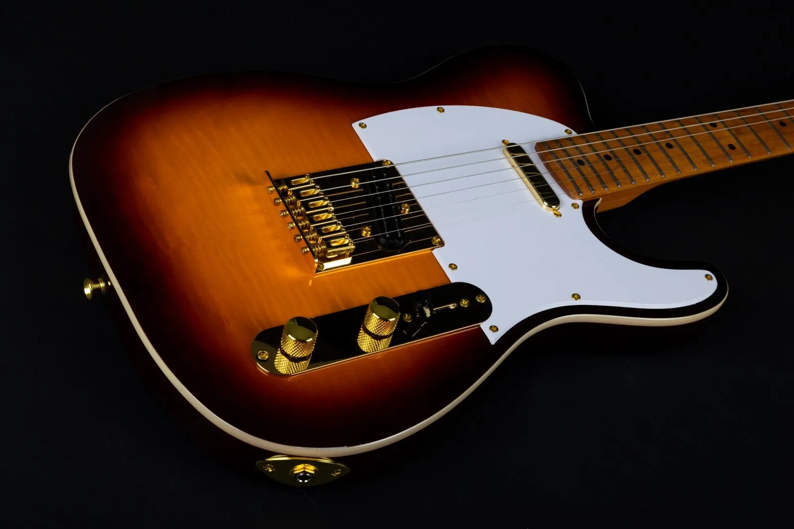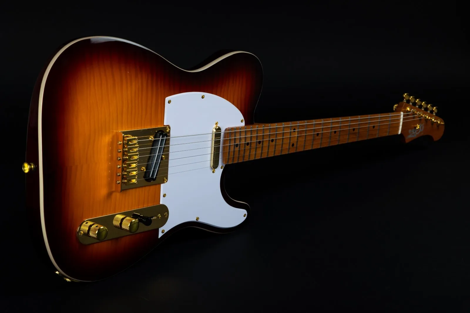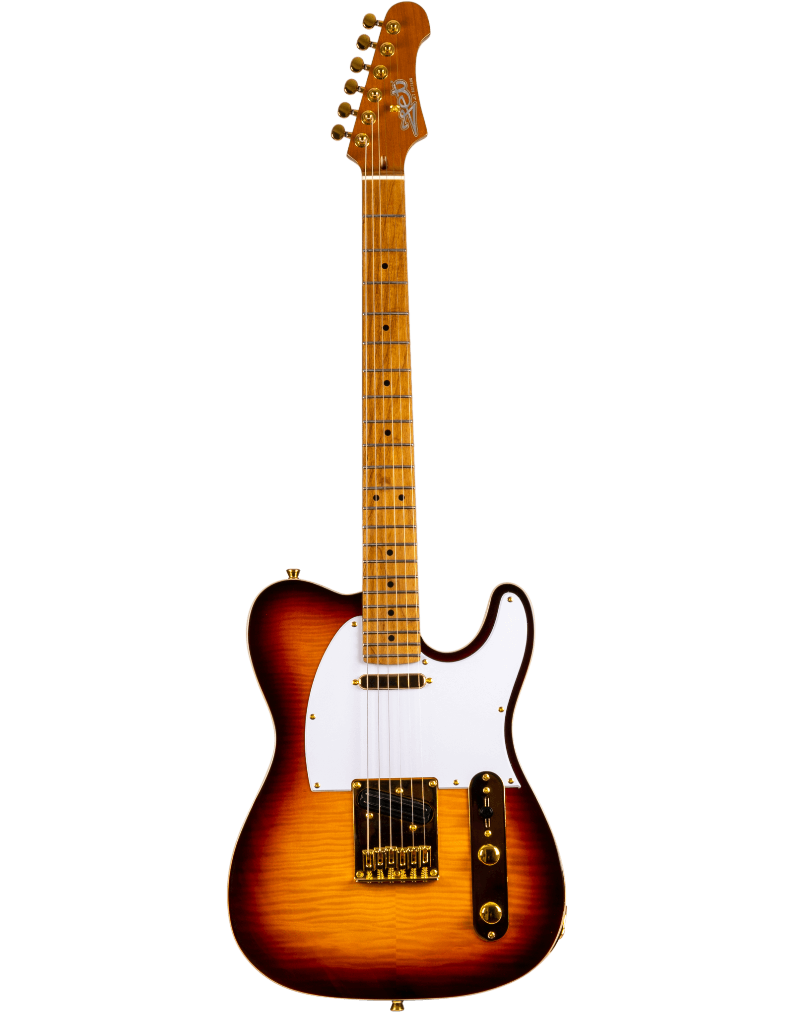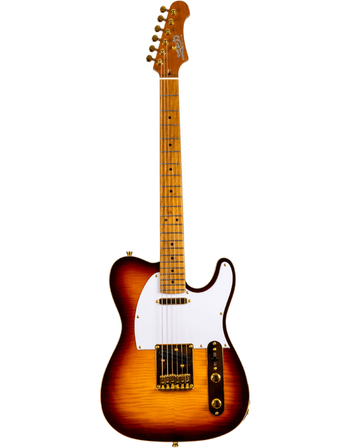 The JET Guitars JT-600 Flamed Maple Top Electric Guitar Roasted MN, finished in Brown Sunburst, features a single-coil-sized rail humbucker in the bridge, and a single-coil in the neck, for everything from glassy cleans to modern gained up tones. Premium features not usually found in guitars this affordable, like a Modern C-Profile Roasted Maple neck and fingerboard, make for hours of easy and comfortable playability. Gold locking machine heads, a bone nut, and fixed bridge provide solid tuning stability. The Brown Sunburst finish really shows off the natural grain of the Flamed Maple top.