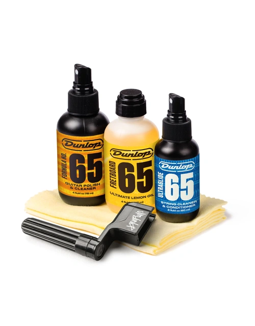 The System 65 Guitar Tech Kit gives you what you need to care for your instrument like the pros: Formula 65 Cleaner-Polish for the body, Fretboard 65 Ultimate Lemon Oil for the neck, and Ultraglide 65 String Cleaner & Conditioner for your strings. Includes two polish cloths and one Dunlop Pegwinder.