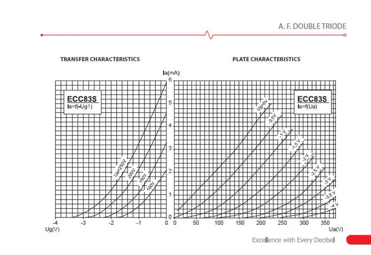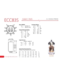A.F. DOUBLE TRIODE - ECC83S is 12AX7 high gain pre-amplifying double triode. Thanks to its design it also performs with very low noise and microphonics. Harmonically rich, with a detailed low end and a warm high end.