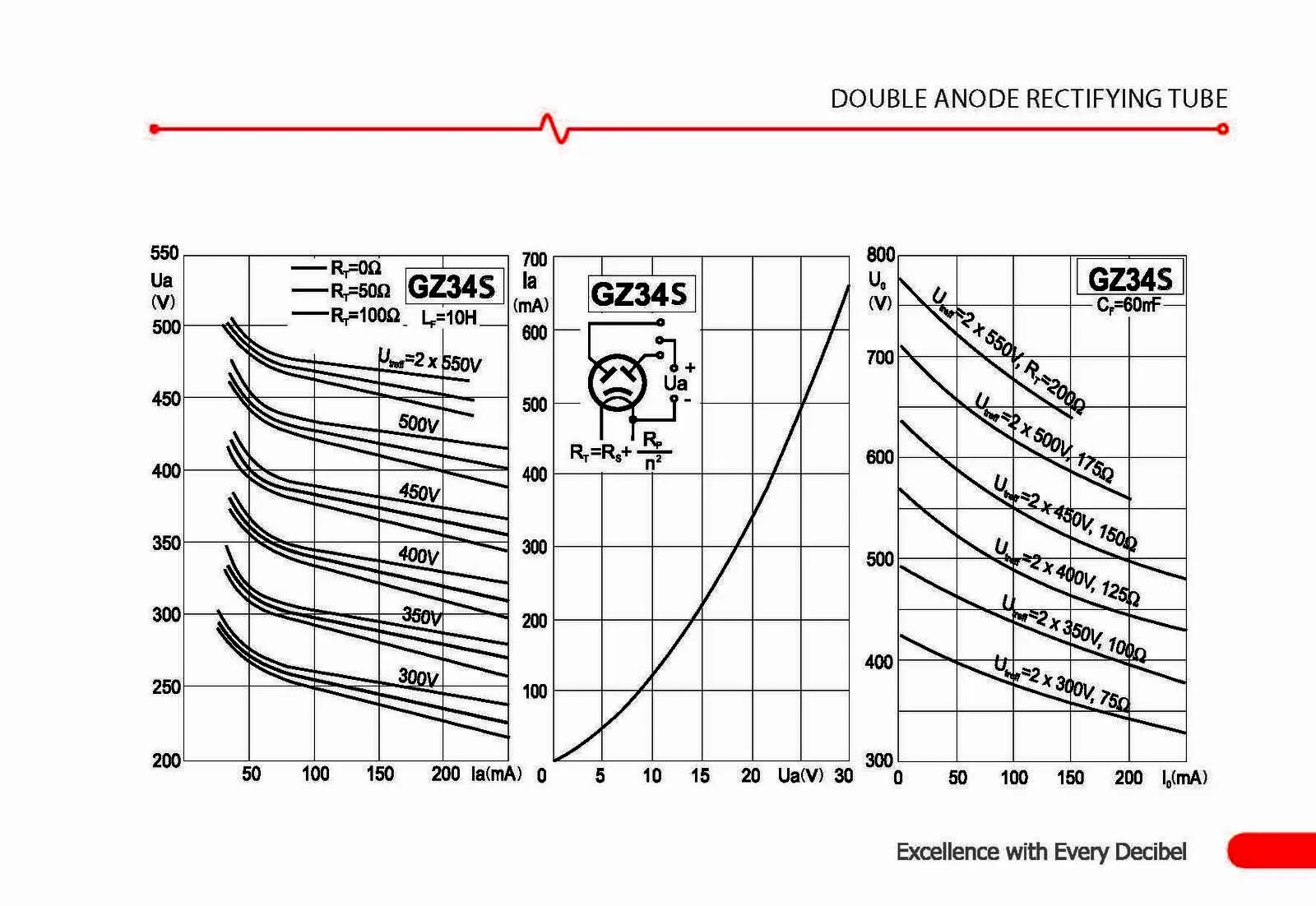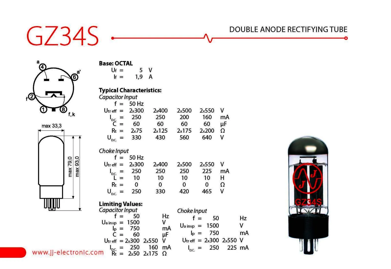 DOUBLE ANODE RECTIFYING TUBE - GZ34S is 5AR4 octal base rectifier diode. It provides strong current output. Suitable for all Hi-Fi and Guitar amplifiers.