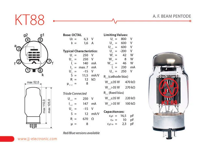 A.F. BEAM PENTODE - KT88 is a beam output pentode with an octal base and power of 42W. Very powerful, with strong bass and very bright highs. It can also be used in 6550 amplifiers.