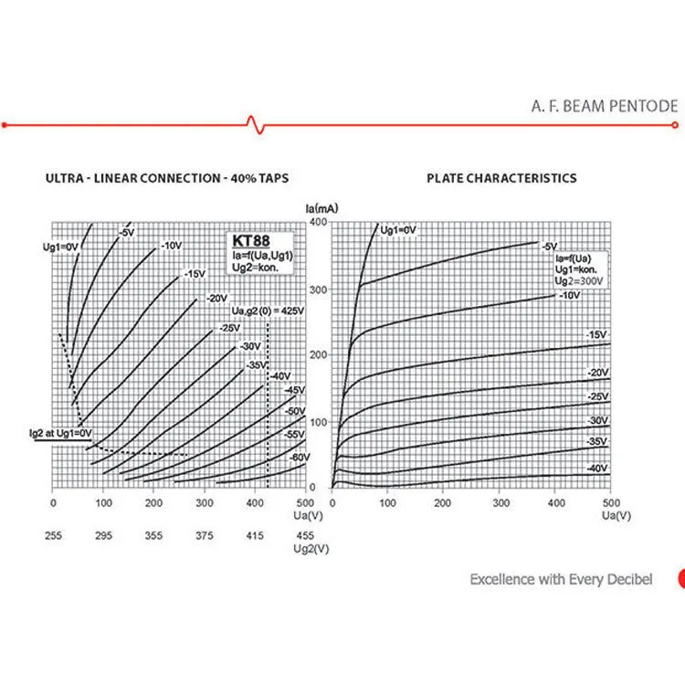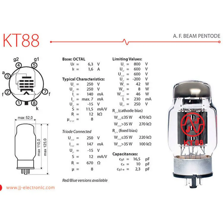 A.F. BEAM PENTODE - KT88 is a beam output pentode with an octal base and power of 42W. Very powerful, with strong bass and very bright highs. It can also be used in 6550 amplifiers.