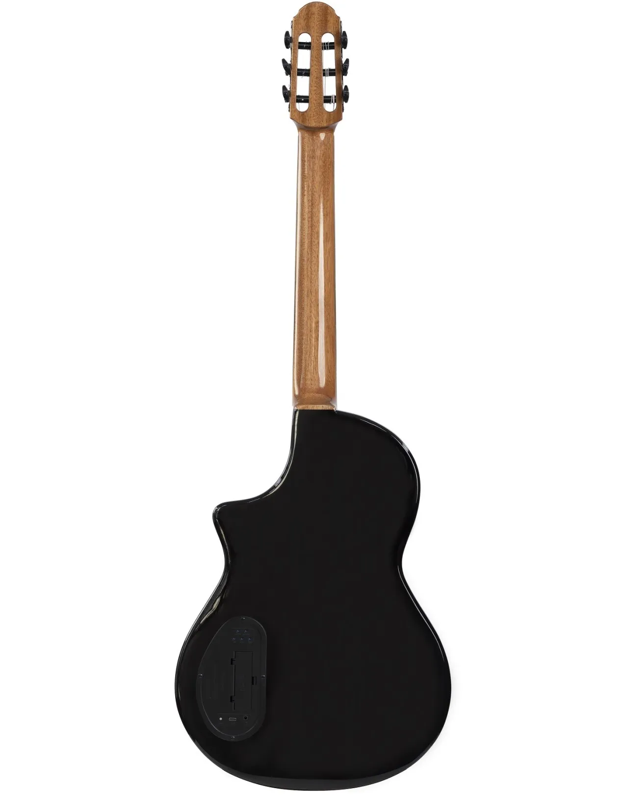 Introducing the Katoh Hispania Chambered Thinline Solidbody Flame Maple/Mahogany Classic Nylon String Guitar with Pickup in Transparent Black. Crafted to perfection, this guitar combines a carved mahogany body with a solid maple soundboard and mahogany neck, delivering exquisite tones at an unbeatable value. Equipped with SG1 Digital electronics featuring reverb, delay, and EQ, seamlessly integrated with a piezo transducer and onboard microphone, this guitar offers unparalleled versatility at an affordable price. With a rechargeable battery, USB-C connectivity for recording, headphone jack for monitoring, and a durable gig bag, it's ready for any performance or practice session.
