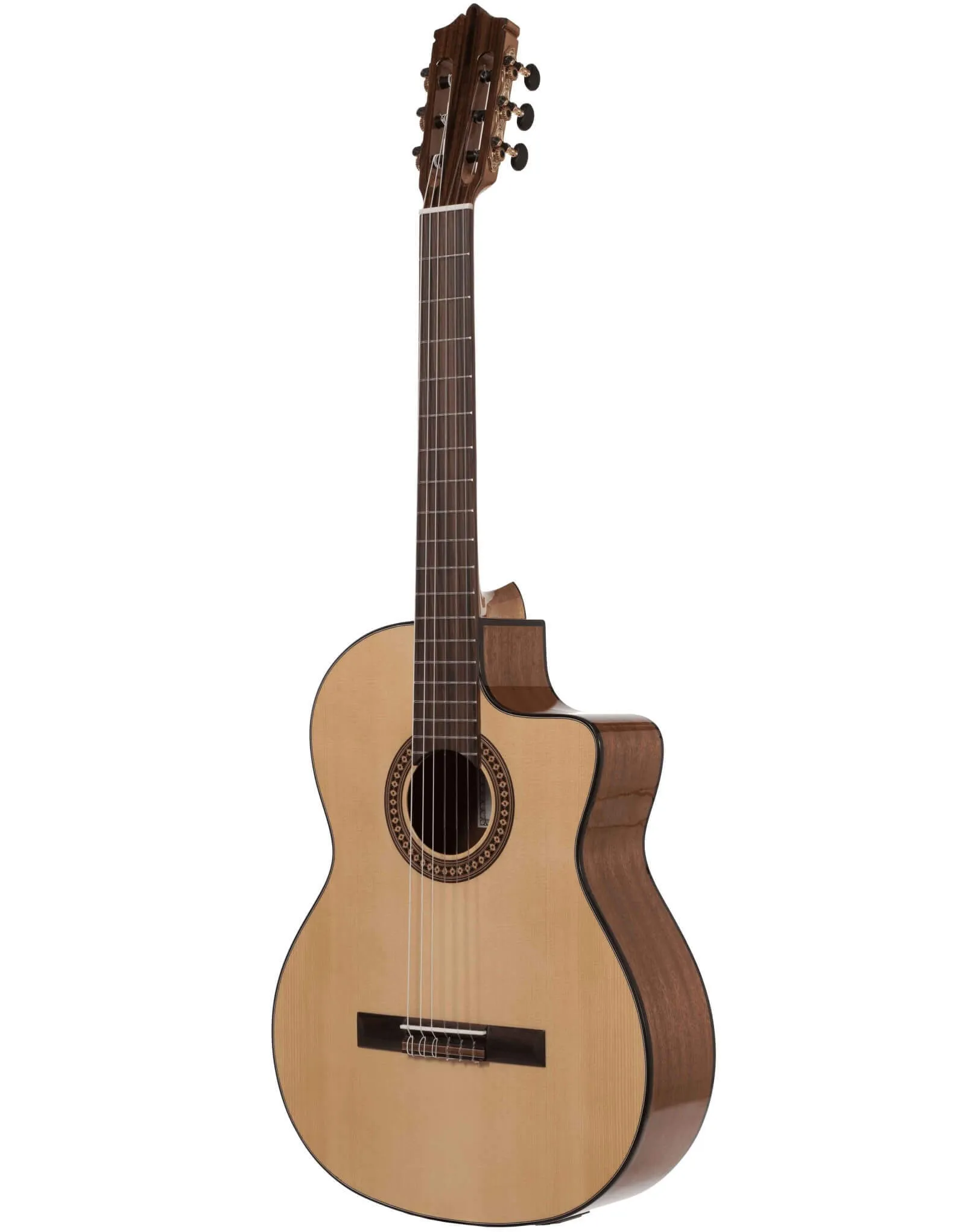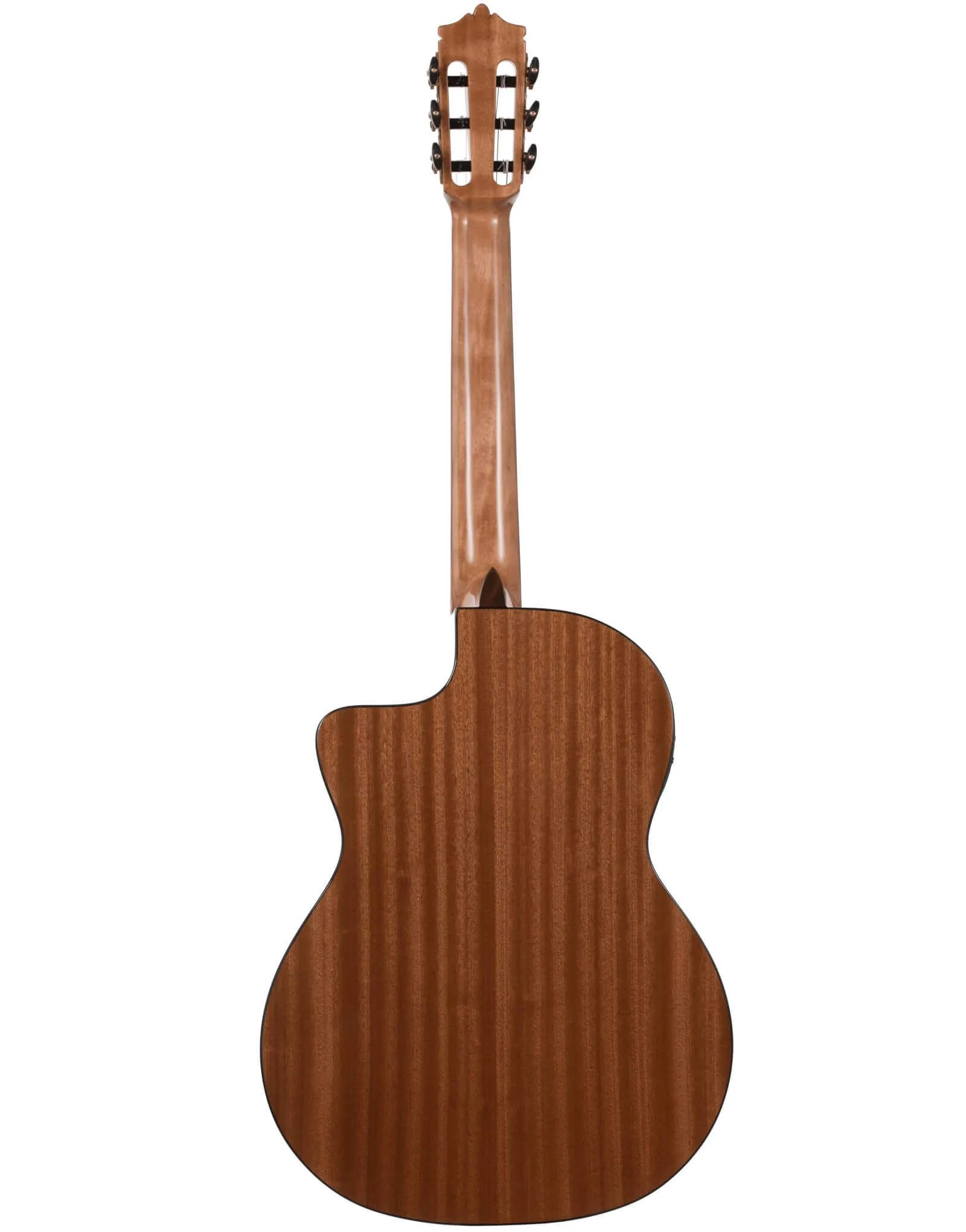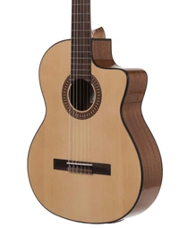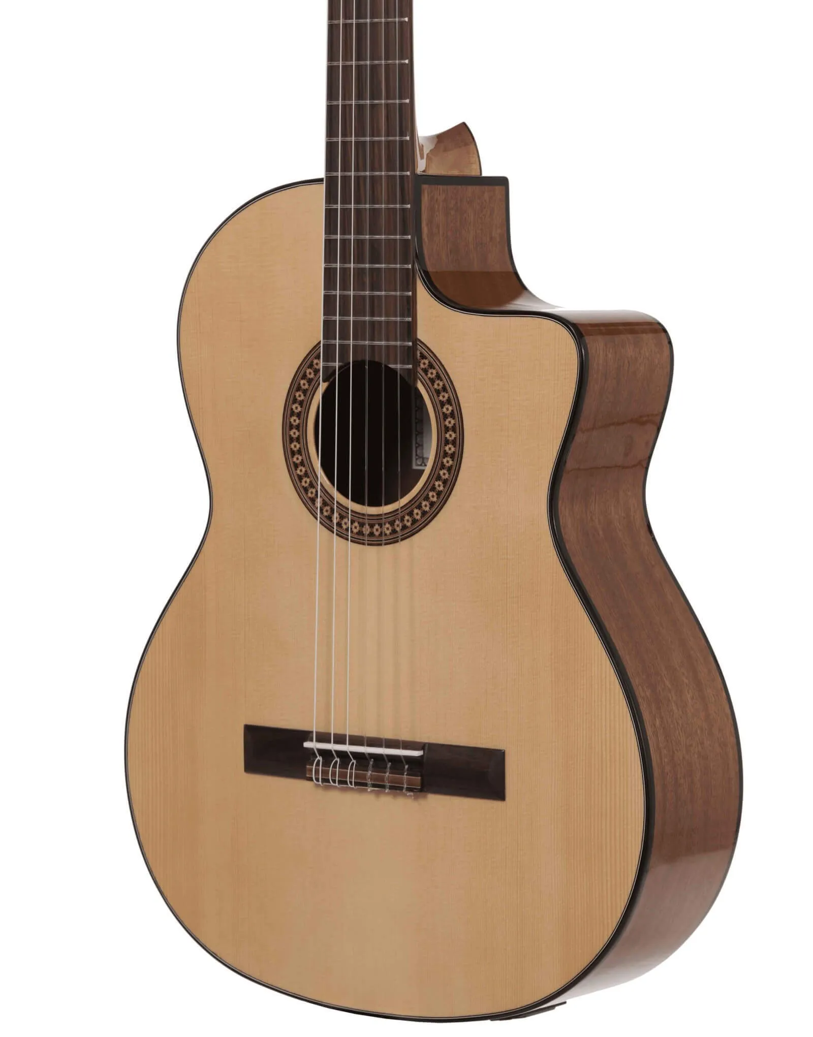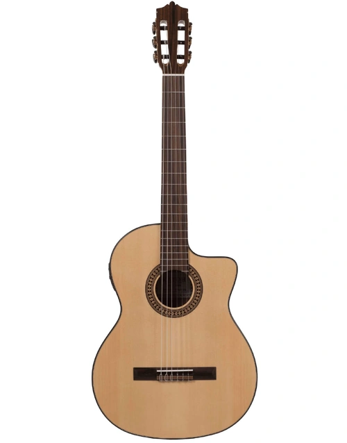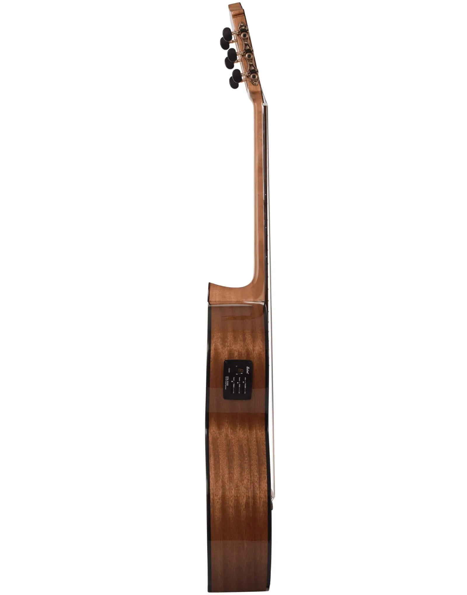 The Katoh MCG20SEQ Classical Nylon String Guitar With Pickup is well loved by teachers for its playability, its comfortable neck and reliable accurate intonation. Its gloss finish is resilient yet thin enough to allow the guitar its full voice. The MCG-20’s full size scale length is a perfect option for older students. It features a laminated spruce top and Sapele back and sides, cutaway and Fishman pickup. Constructed with Spanish Fan bracing, the MCG20SEQ is beautifully constructed and produces a great amplified sound.