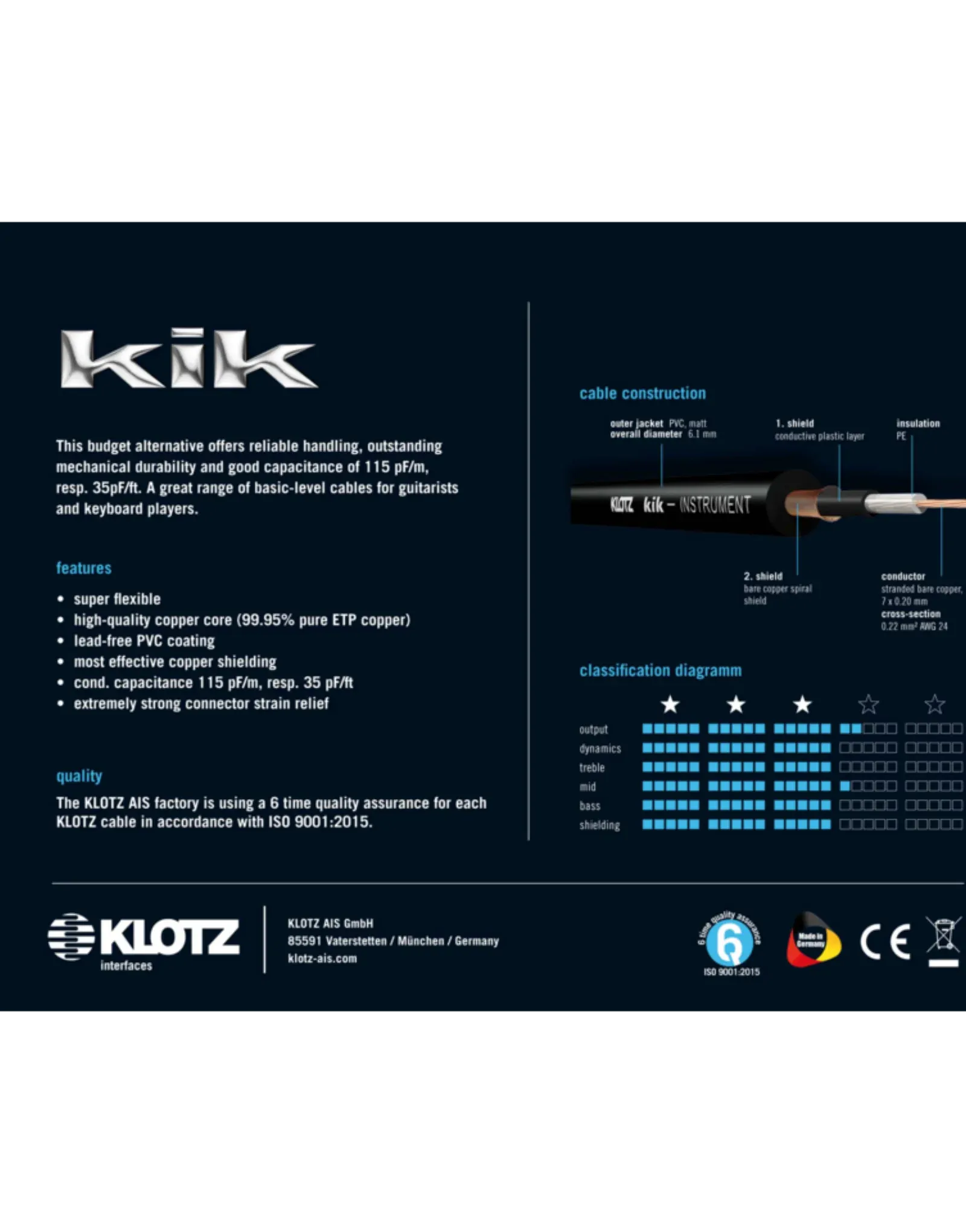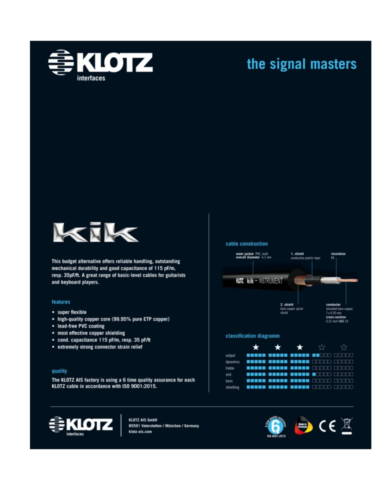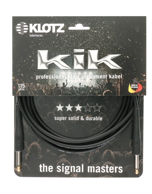 KLOTZ' best-selling KIK Cable delivers everything a pro instrument cable needs: reliability, ruggedness and great capacitance. The design confirms the status of the KIK series as high-quality cables at a budget price; the quality oxygen-free copper conductors (purity 99.95%) are enclosed by a lead-free PVC jacket, a conductive plastic shield and a highly efficient copper spiral shield to maximize the KIK’s flexibility. The solid strain relief element withstands forces of over 200 newtons. All that, and good looks too. Reliable and great to handle. For ambitious entry-level musicians. Effective spiral shield. Warm, rich sound. Extra-strong strain relief (> 200 Nm). Ultra flexible. Jack 2p., 6.35 mm, angled and straight, gold-plated contact by KLOTZ.