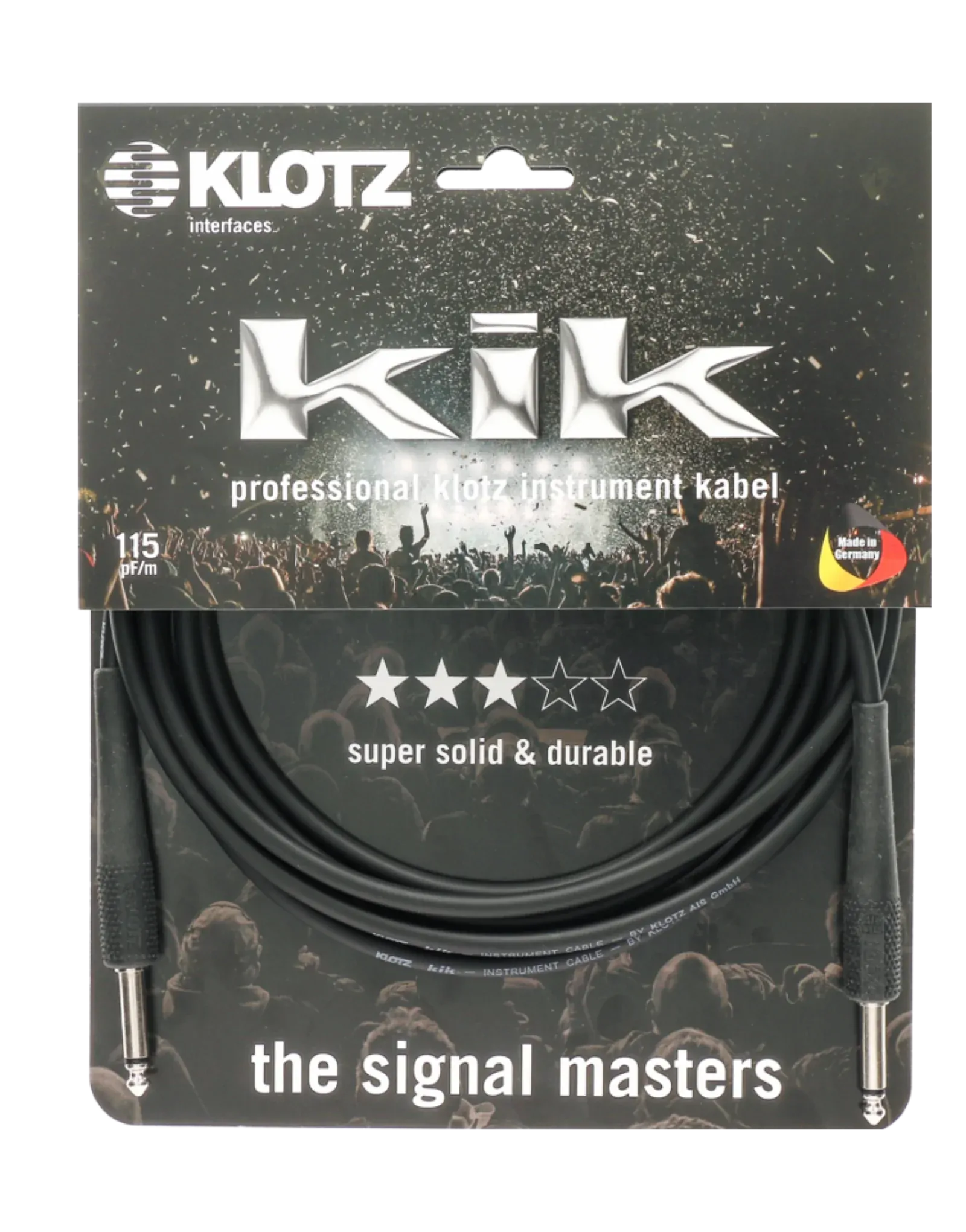 KLOTZ' best-selling KIK Cable delivers everything a pro instrument cable needs: reliability, ruggedness and great capacitance. The design confirms the status of the KIK series as high-quality cables at a budget price; the quality oxygen-free copper conductors (purity 99.95%) are enclosed by a lead-free PVC jacket, a conductive plastic shield and a highly efficient copper spiral shield to maximize the KIK’s flexibility. The solid strain relief element withstands forces of over 200 newtons. All that, and good looks too. Reliable and great to handle. For ambitious entry-level musicians. Effective spiral shield. Warm, rich sound. Extra-strong strain relief (> 200 Nm). Ultra flexible.