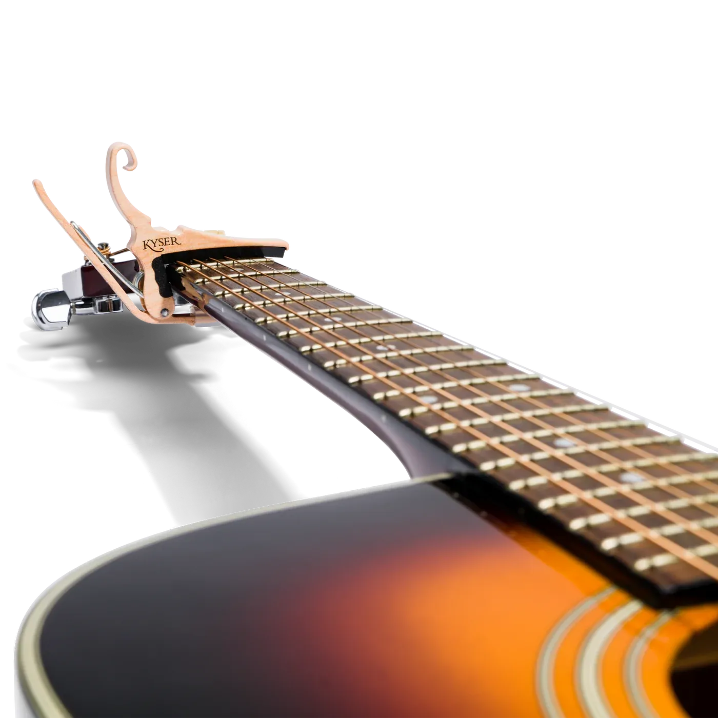 The first. The fastest. The Original. Kyser Quick-Change acoustic guitar capos changed everything when they hit the clubs of Deep Ellum, Texas in the 1980s, and they’re still the quickest capos in the West, coveted by the biggest artists on the world's biggest stages. The unique trigger mechanism never misfires. Stick it on whatever fret you’d like and it stays where it should, or leave it on the headstock ‘til you need it. Your Kyser keeps close.