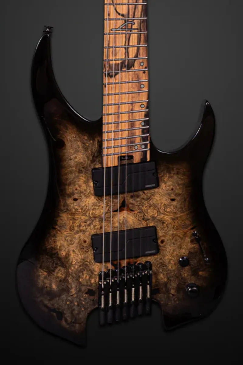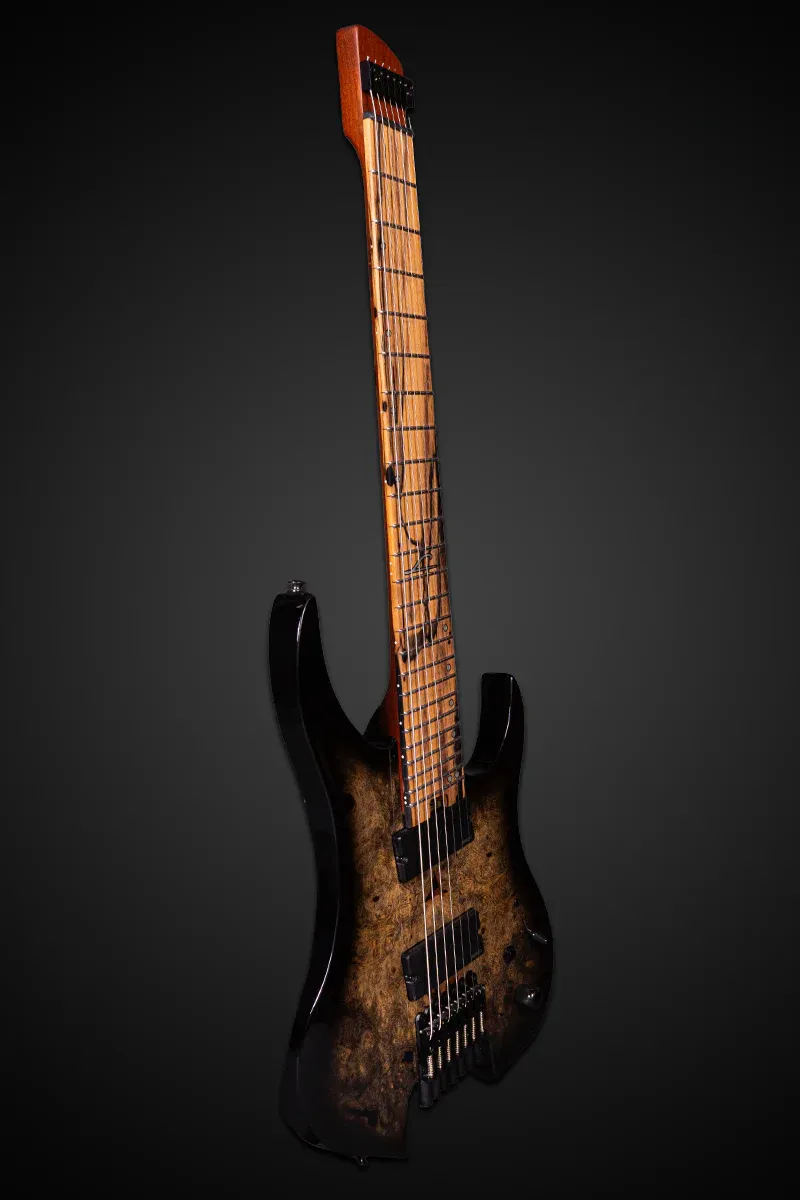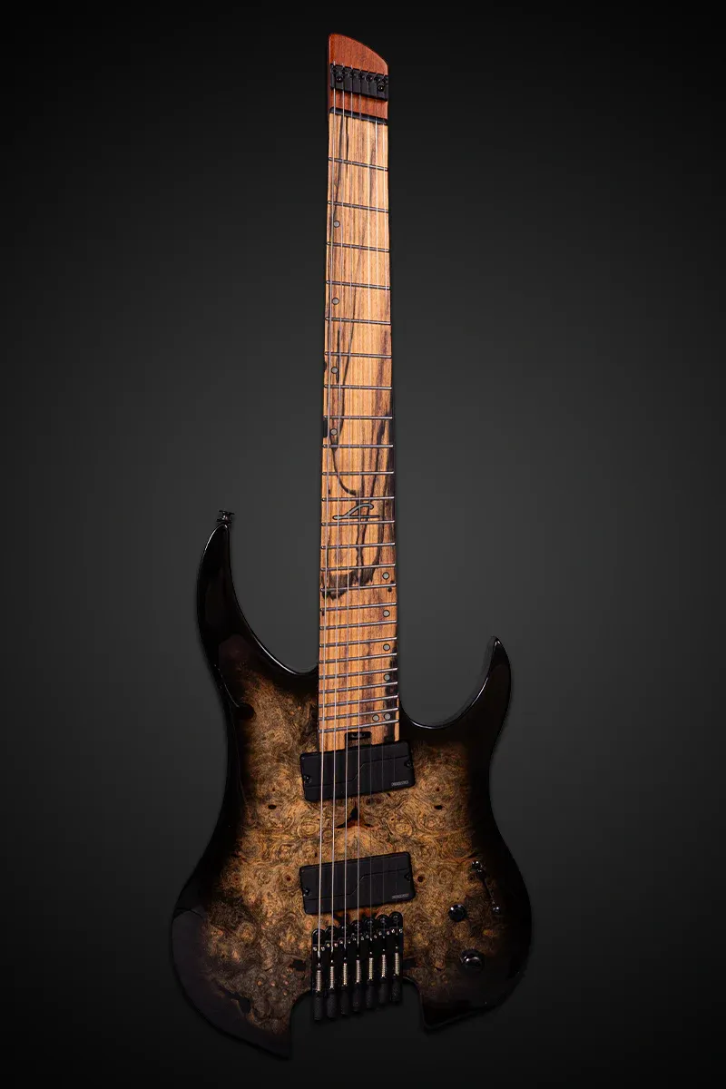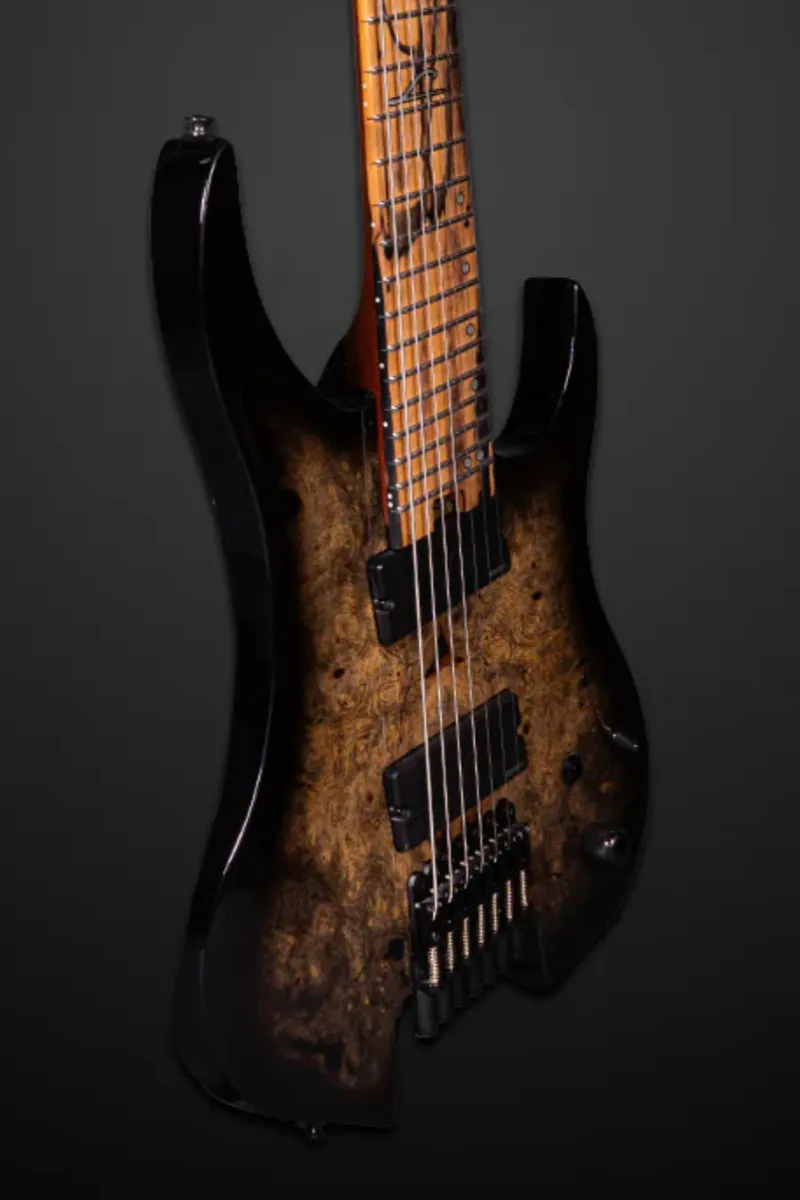 The Legator G7FOD Ghost Overdrive 7-String in Jupiter Burst Gloss is designed for modern players who demand precision and power. Its alder body with a California Buckeye Burl top offers resonance and striking aesthetics, while the 25.5"–26.5" multi-scale design optimises tension and intonation across all strings. The roasted maple neck and 18" radius pale moon ebony fingerboard provide smooth, fast playability with Luminlay side dots for visibility in low light. Fishman Fluence Modern pickups with push/pull voice selection deliver a wide range of aggressive, articulate tones, while the LED killswitch adds on-the-fly performance control. A locking head bar and fine-tuning bridge ensure rock-solid tuning stability. At Riffs & Licks Music, we think this G7FOD is perfect for players wanting cutting-edge tone, versatility, and jaw-dropping looks in a high-performance 7-string.