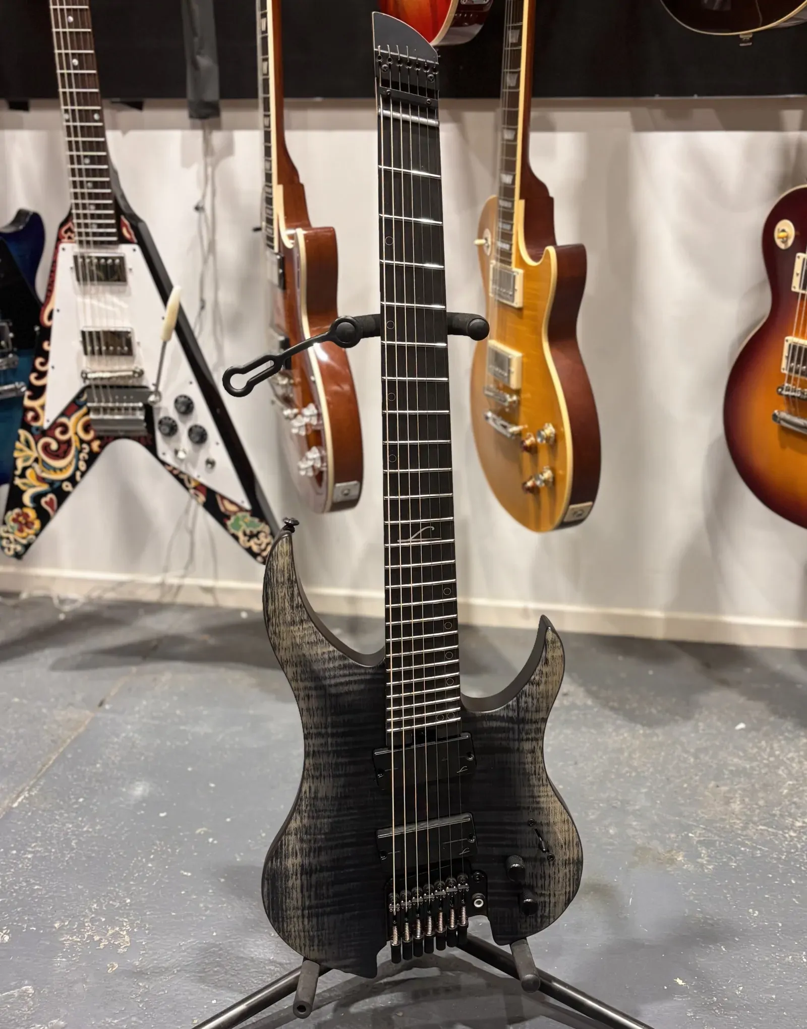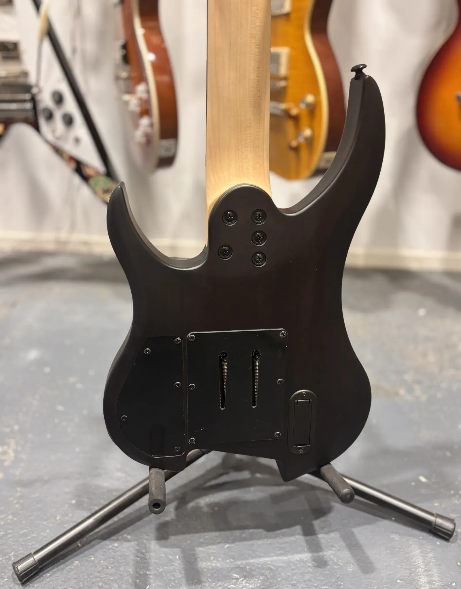 The Legator G7FT Ghost Super Shred 7 String Multi-Scale is built for high-speed riffs and intense shredding. Its lightweight mahogany body with a flame maple top delivers resonance and durability, while the multi-scale design (25.5"-26.5") provides enhanced intonation and clarity. A 3-piece bolt-on maple neck paired with a 12"-16" compound radius Richlite fingerboard ensures smooth playability. Featuring Legator AfterShock active humbuckers, this guitar delivers crushing tones with precision. Complete with a locking headpiece, floating tremolo bridge, and sleek black finish, it's perfect for metal players who need reliable performance.