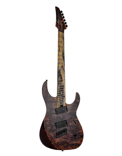 Legator N6FX Ninja X 6 String Multi-Scale is part of Legator's flaghsip X series, featuring premium tonewoods and appointments, and the incredible new Blood Moon finish. The combination of a super solid set-through 5 piece Wenge/Maple neck with 25.5"-27" multiscale, an eye-catching 16" radius Pale Moon Ebony fretboard, and 24 medium jumbo stainless steel frets, lets you shred comfortably and ergonomically for hours on end. A set of Fishman Fluence Modern pickups, with Push/Pull Voice Selection, sound brutal thanks to a solid Ash body and California Buckeye Burl top. Fishman Fluence pickups combine the soul of your favourite passive humbuckers, with the raw power and brutal aggression of actives. Voice 1 dishes out plenty of searingly crispy and crunchy tone - forget about mud, this setting has nothing but tight bass and the perfect amount of growl. Voice 2 is more organic, like a high-output passive - this setting loves distortion, and handles it with classic Fluence dynamics and response. The X series features plenty more player-friendly features, like a slick satin finish, Pro fixed bridge and locking tuners, a killswitch, deluxe gig bag, and Luminlays on the side and the fretboard.