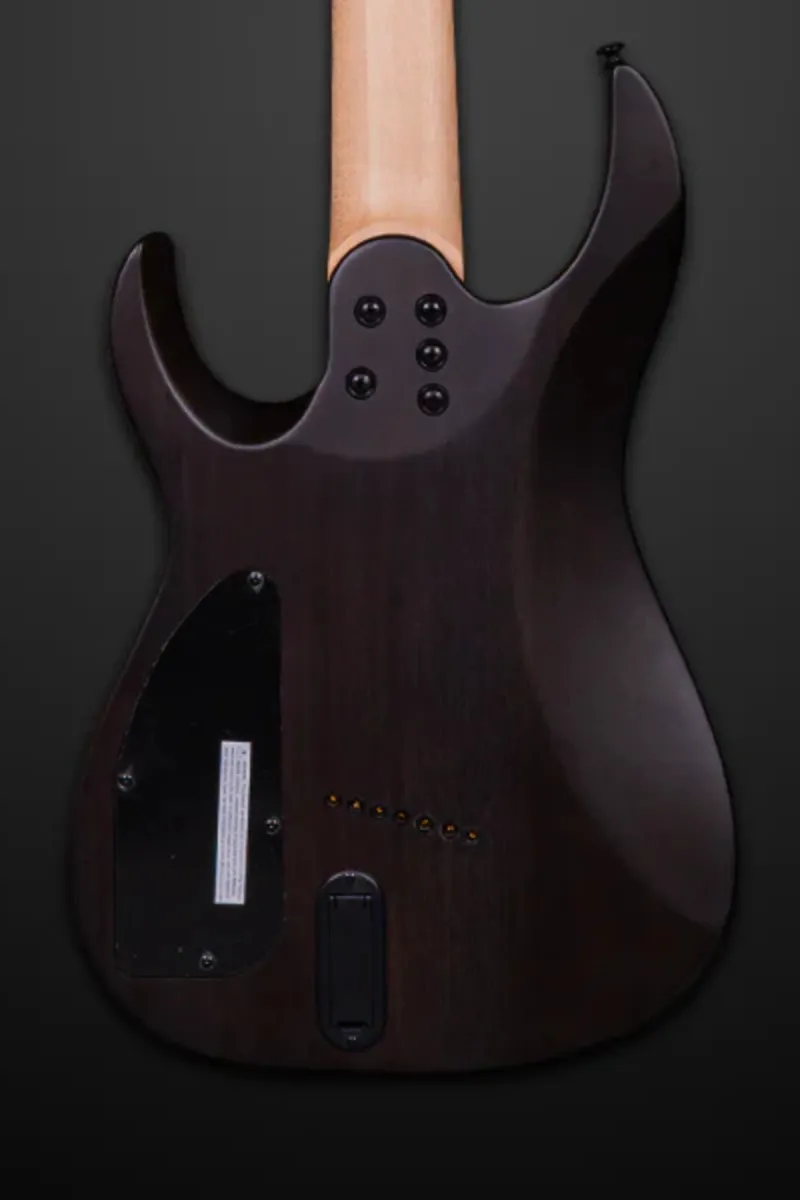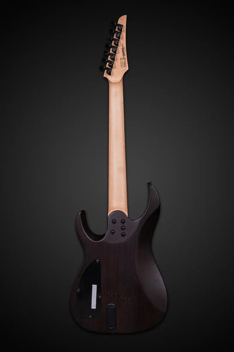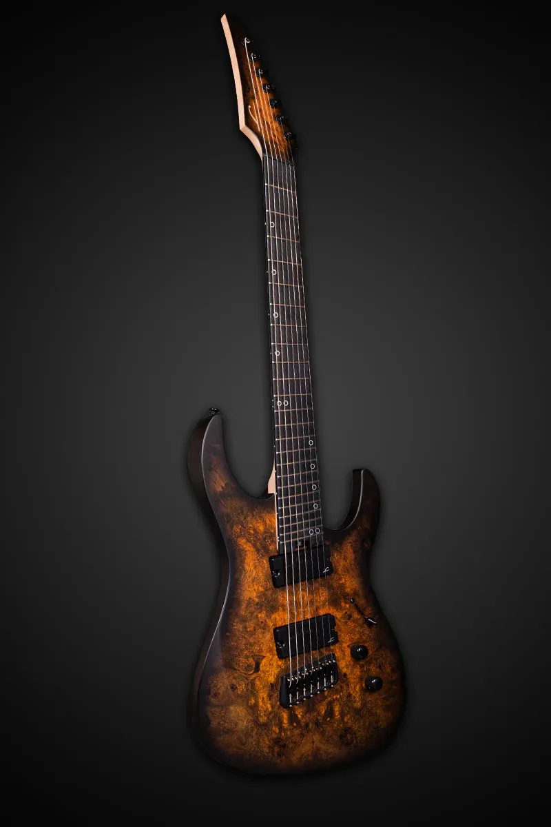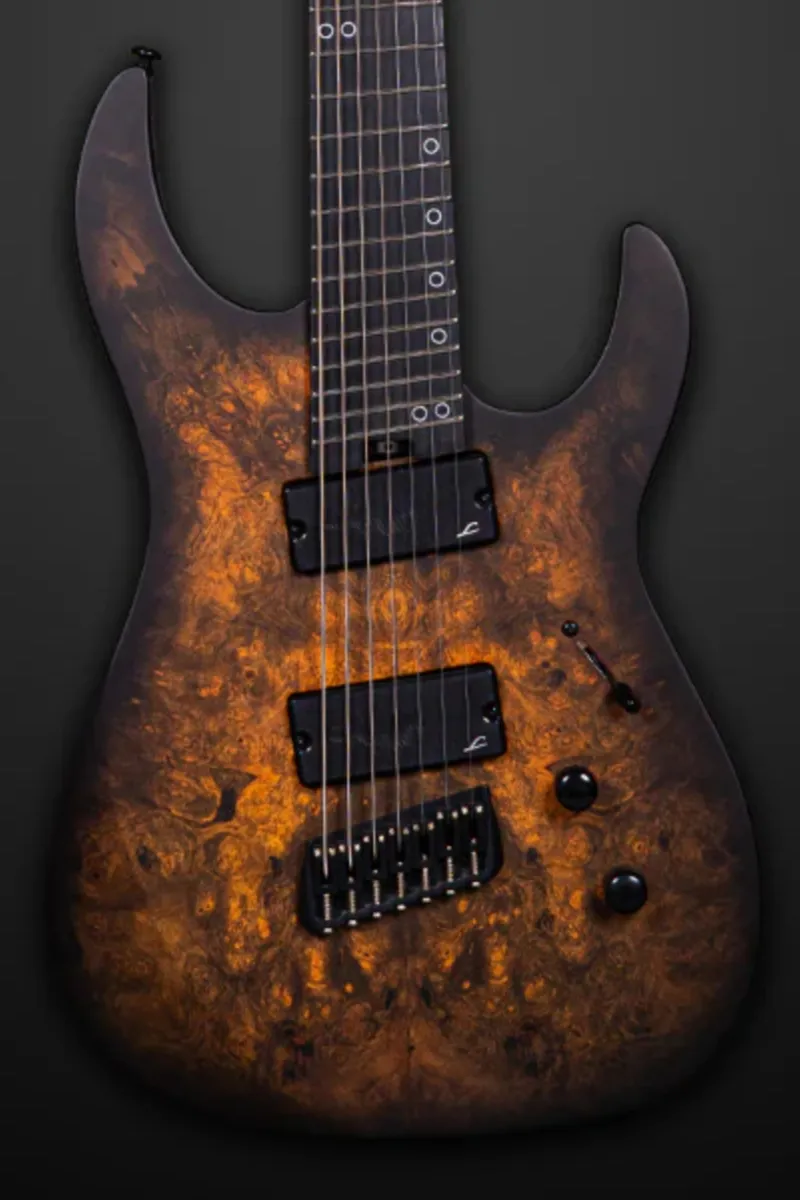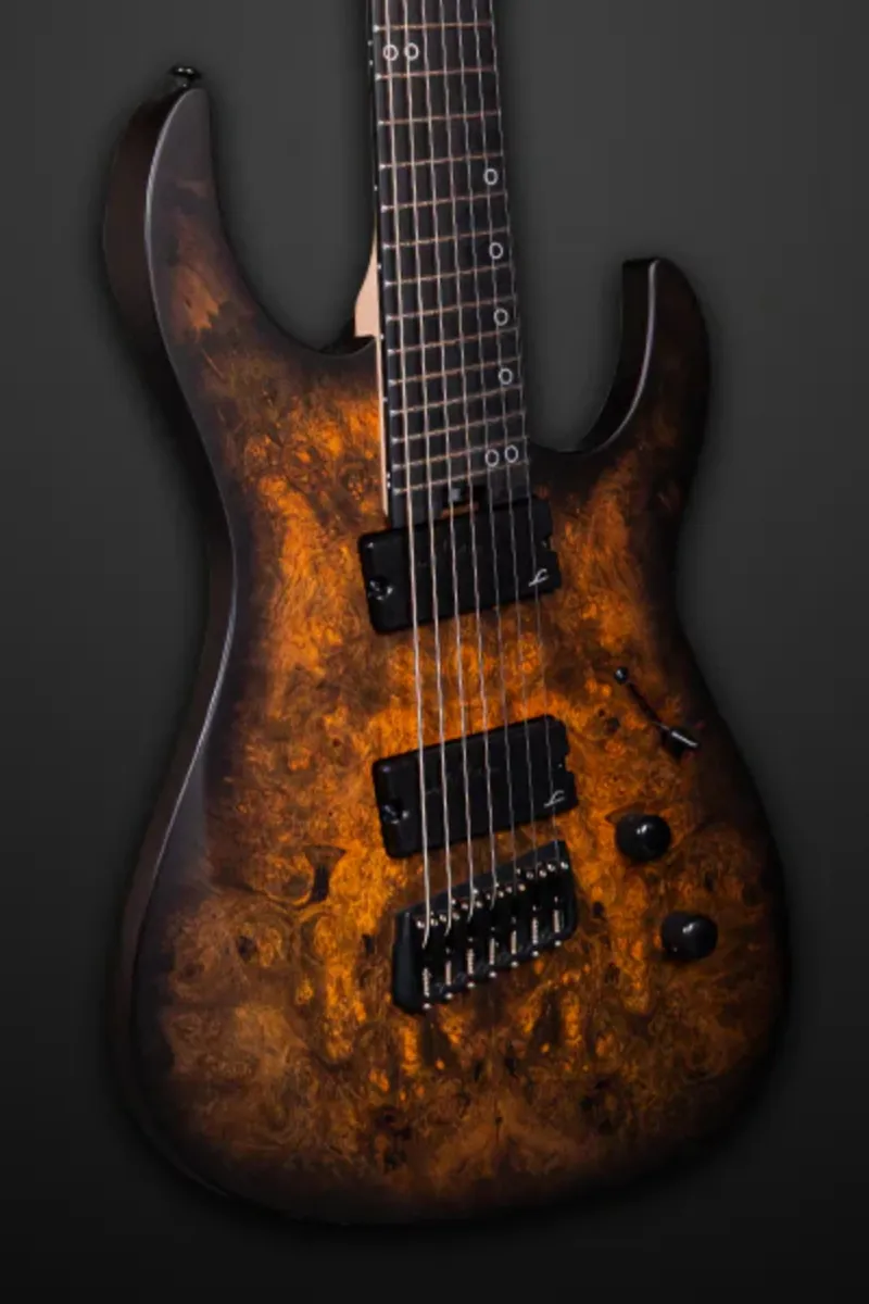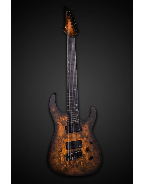 The Legator N7FSS Ninja Super Shred 7-String in Death Valley Buckeye Burl is built for serious shredders looking for precision and power. Its lightweight 38mm mahogany body and striking buckeye burl top deliver resonance and aggressive looks, while the 25.5"–26.5" (648–673mm) multi-scale design optimises string tension and intonation. The 3-piece bolt-on maple neck and 14"–16" compound radius Richlite fingerboard provide smooth, fast playability, paired with 24 jumbo stainless-steel frets for durability and effortless bends. Legator Aftershock active humbuckers produce tight, crushing tones with clarity, controlled by master volume, master tone, and a 3-way blade switch. A Graphtech nut, brass multiscale bridge, and locking tuners keep tuning rock-solid under heavy playing. At Riffs & Licks Music, we think the N7FSS is ideal for modern metal players who demand extended range, powerful tone, and unmatched playability.