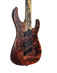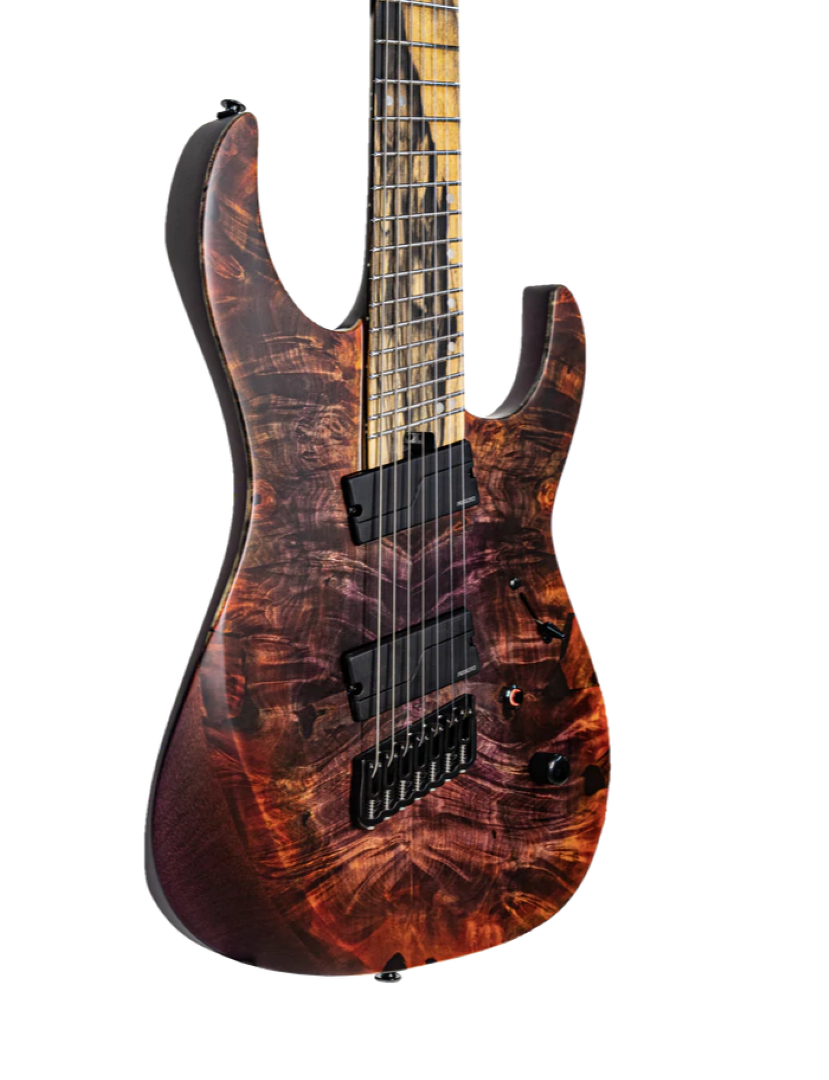 The Legator N7FX Ninja X 7 String Multi-Scale is part of Legator's flaghsip X series, featuring premium tonewoods and appointments, and the incredible new Blood Moon finish. The combination of a super solid set-through 5 piece Wenge/Maple neck with 25.5"-27" multiscale, an eye-catching 18" radius Pale Moon Ebony fretboard, and 24 medium jumbo stainless steel frets, lets you shred comfortably and ergonomically for hours on end. A set of Fishman Fluence Modern pickups, with Push/Pull Voice Selection, sound brutal thanks to a solid Ash body and California Buckeye Burl top. Fishman Fluence pickups combine the soul of your favourite passive humbuckers, with the raw power and brutal aggression of actives. Voice 1 dishes out plenty of searingly crispy and crunchy tone - forget about mud, this setting has nothing but tight bass and the perfect amount of growl. Voice 2 is more organic, like a high-output passive - this setting loves distortion, and handles it with classic Fluence dynamics and response. The X series features plenty more player-friendly features, like a slick satin finish, Pro fixed bridge and locking tuners, a killswitch, deluxe gig bag, and Luminlays on the side and the fretboard.