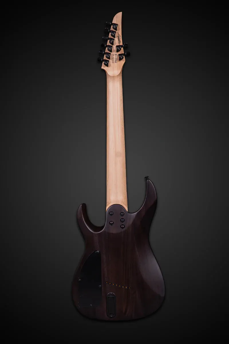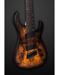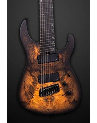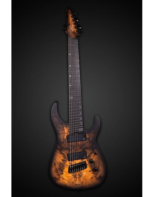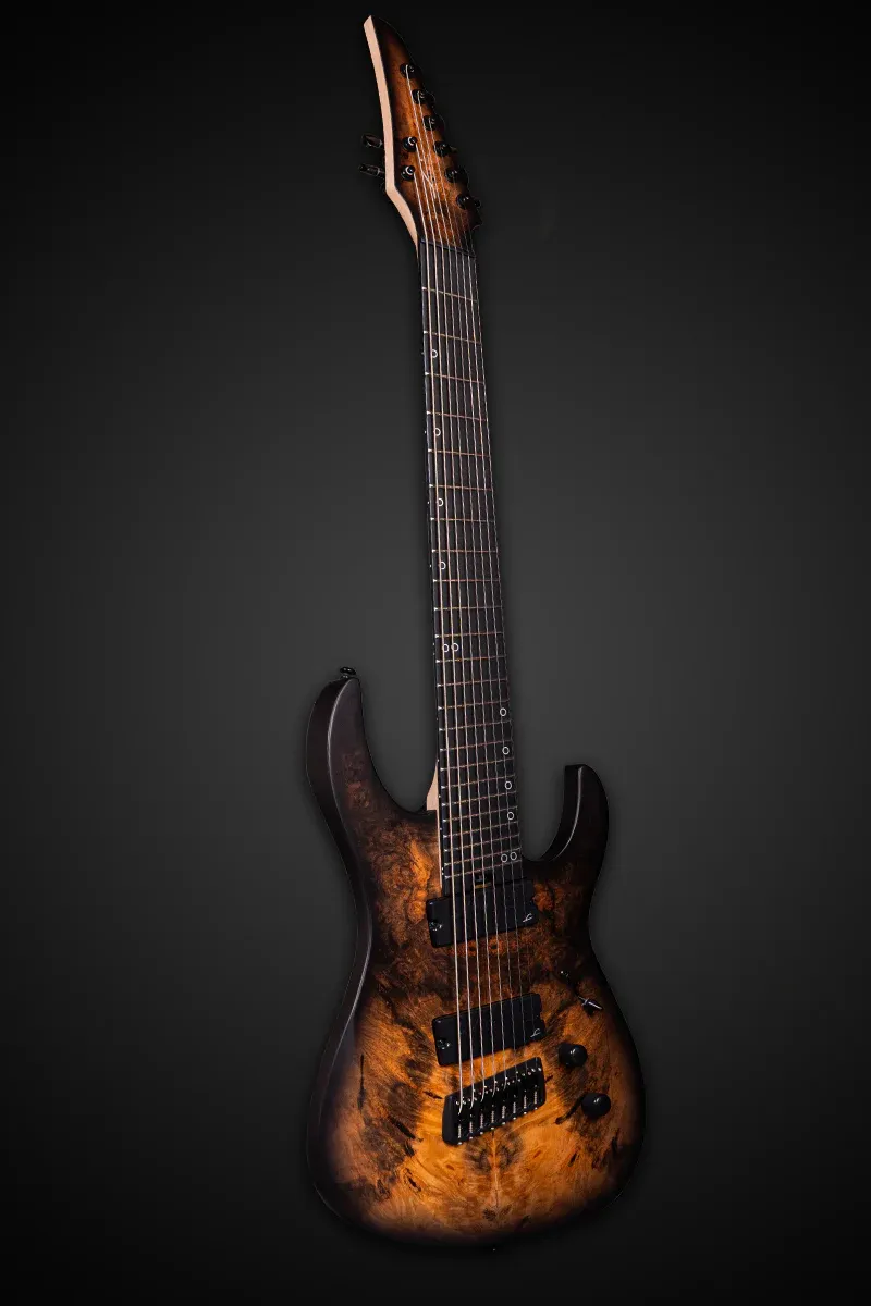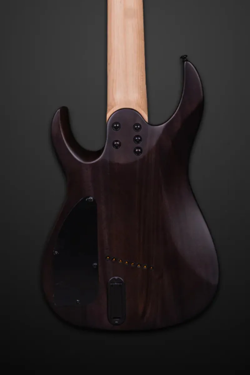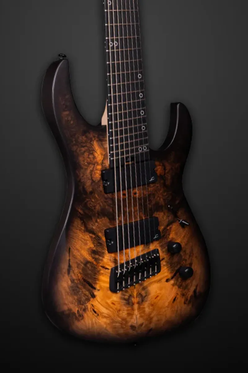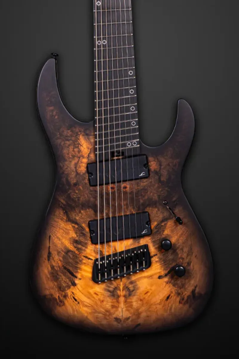 The Legator N8FSS Ninja Super Shred 8-String in Death Valley Buckeye Burl is designed for players seeking maximum range, precision, and speed. Its 38mm-thick mahogany body with a buckeye burl top delivers a resonant, aggressive tone, while the 26.5"–27.5" (673–699mm) multi-scale design ensures even tension and accurate intonation across all eight strings. The 3-piece bolt-on maple neck and 12"–16" compound radius Richlite fingerboard offer a fast, smooth feel, paired with 24 jumbo stainless-steel frets for effortless shredding. Legator Aftershock active humbuckers provide high-output clarity and punch, while a Graphtech nut, brass multi-scale bridge, and locking tuners deliver excellent tuning stability. At Riffs & Licks Music, we think the N8FSS is the perfect choice for extended-range guitarists who demand cutting-edge performance and crushing tone.