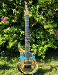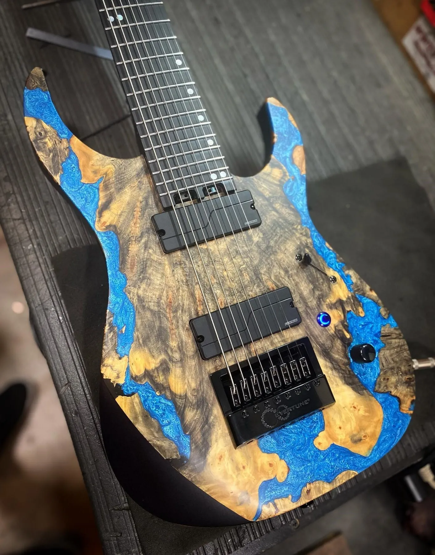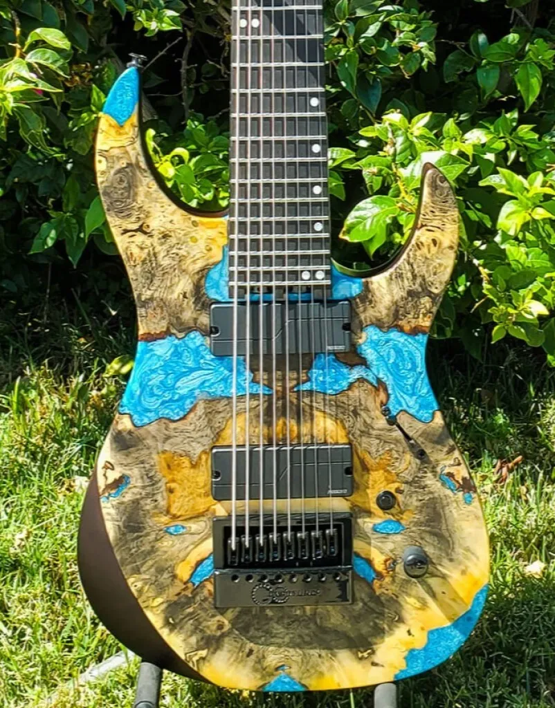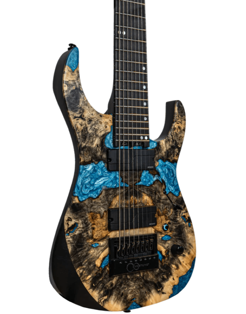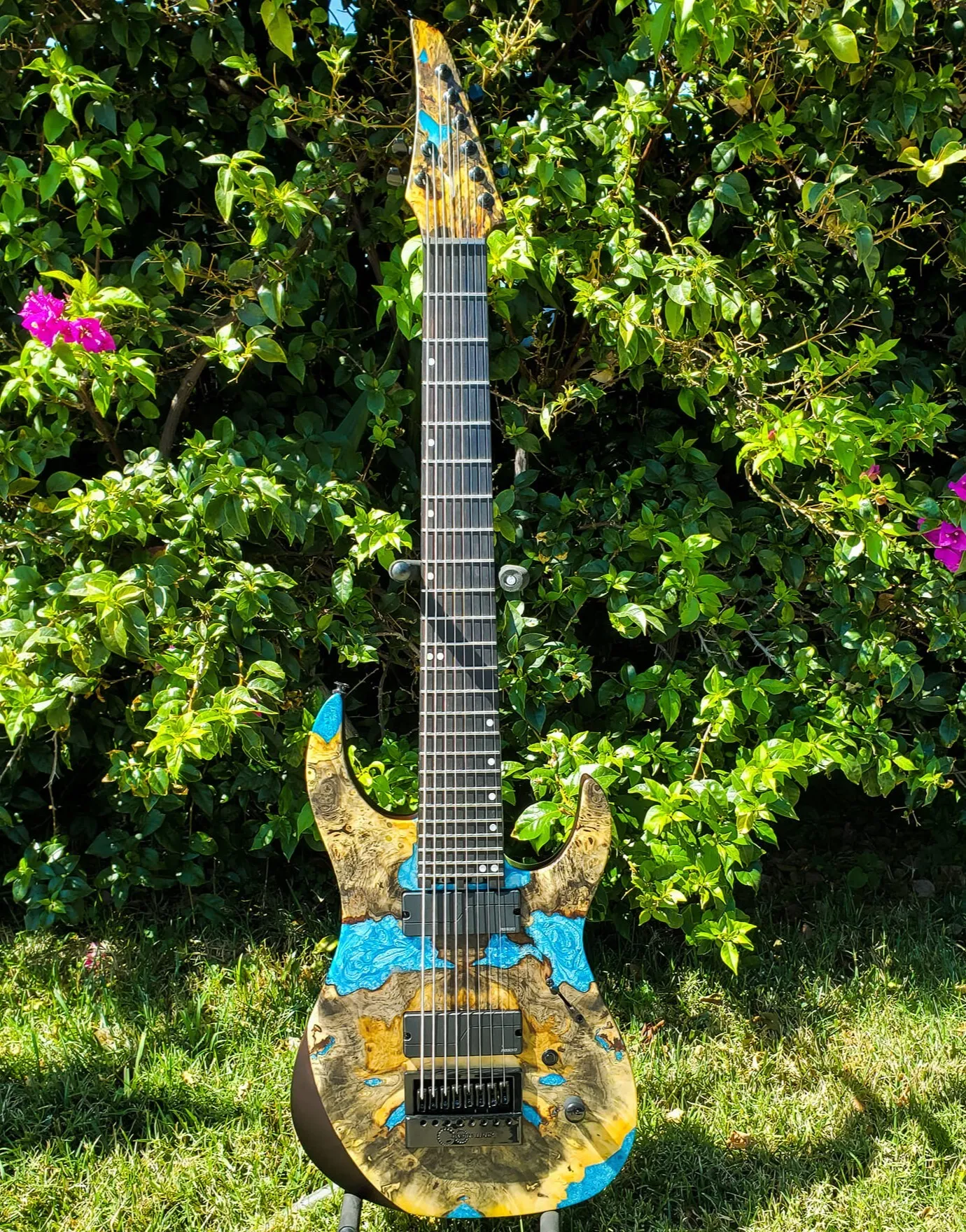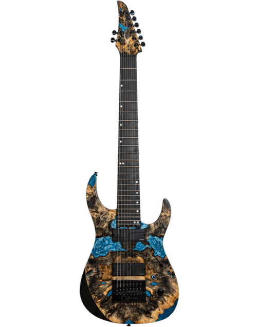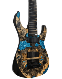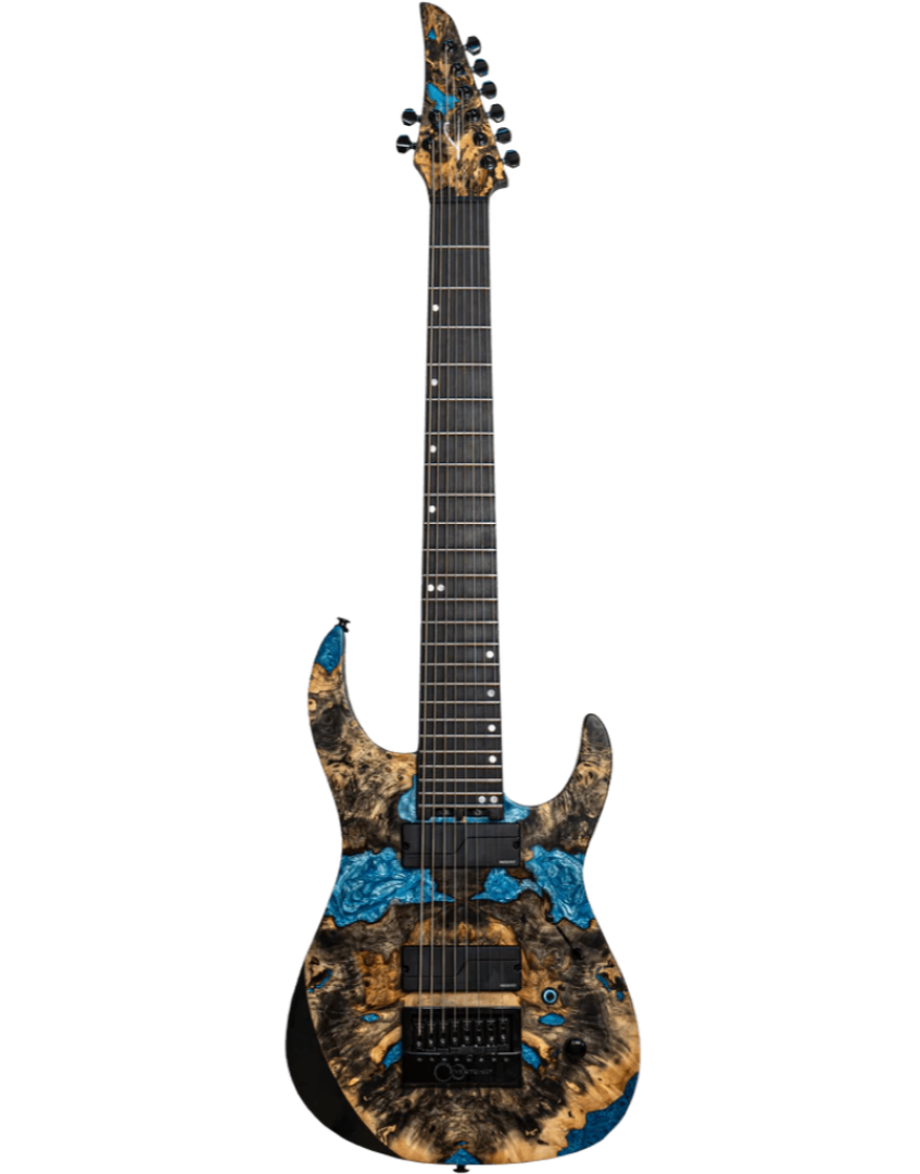 The Legator X8 Ninja X 8 String is part of Legator's flagship X series, featuring premium tonewoods and appointments, and the incredible new epoxy resin-infused Caribbean Blue finish, which really makes the grain pop on the California Buckeye Burl top.