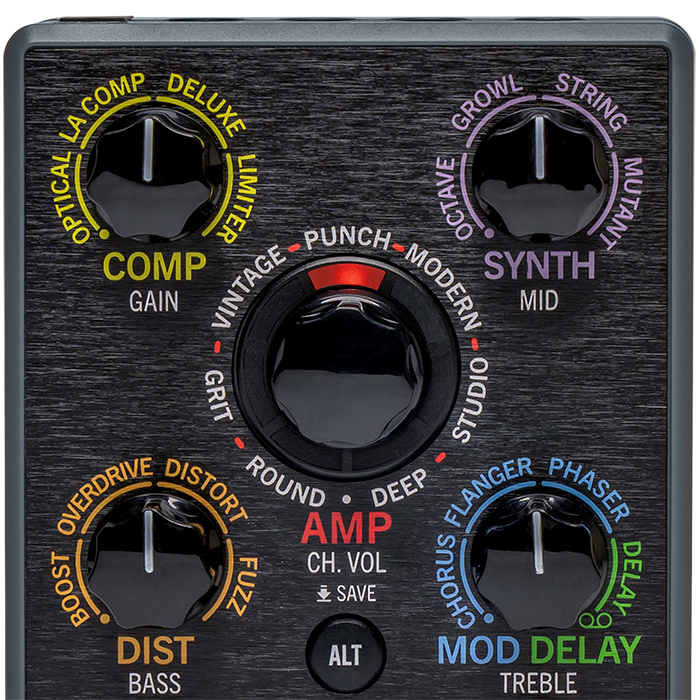 The layout focuses on immediate control. Dedicated knobs select amp models and effects, while the LED ring clearly shows parameter levels. Distortion, compression, synth, modulation, and delay effects are available alongside a built-in looper, making the Line 6 POD Express Bass useful for practice, songwriting, and live performance. Stereo outputs allow the processor to feed amplifiers, powered speakers, or recording systems, while the headphone output supports silent practice.
