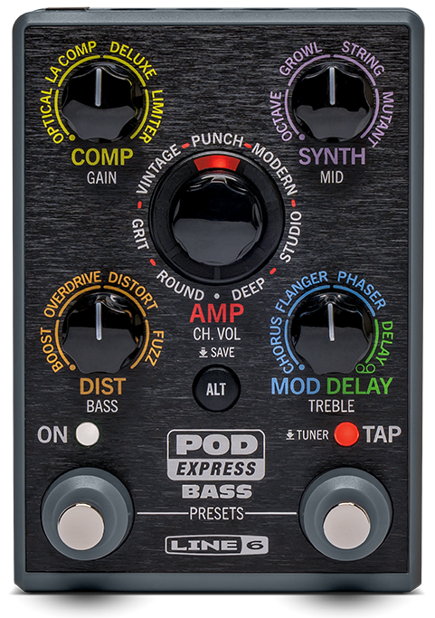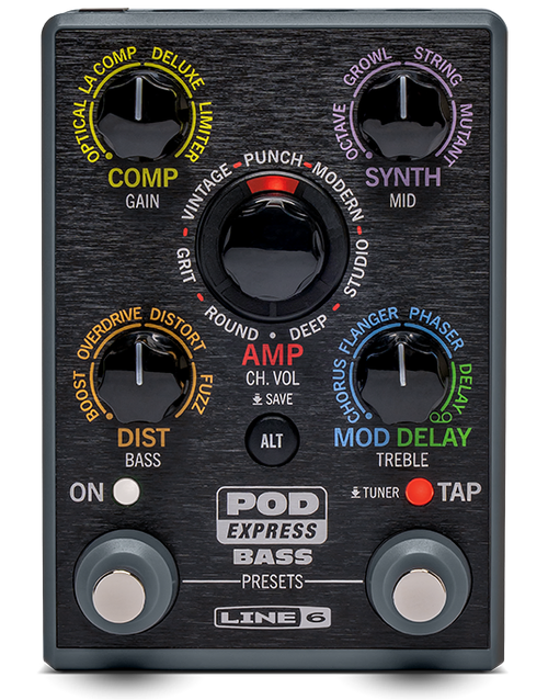 Line 6 POD Express Bass is designed for bassists who want a full amp and effects setup in a device small enough to travel anywhere. The unit combines seven bass amp models, seven matching cabinets, and a wide range of effects derived from the HX processor family. These models deliver the dynamic response and tonal detail associated with larger digital rigs while remaining simple to control from the front panel. The result is a flexible bass tone platform that can move from clean, punchy sounds to driven textures and ambient effects without complicated menu navigation.