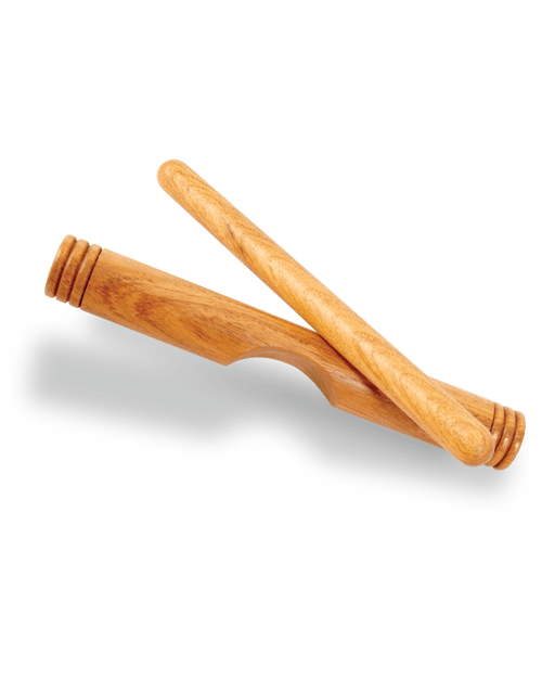 Claves are the instrument used to play 'clave:' foundational rhythmic pattern used in much of Latin music. By striking two wooden sticks together, a bright, cracking sound is produced.