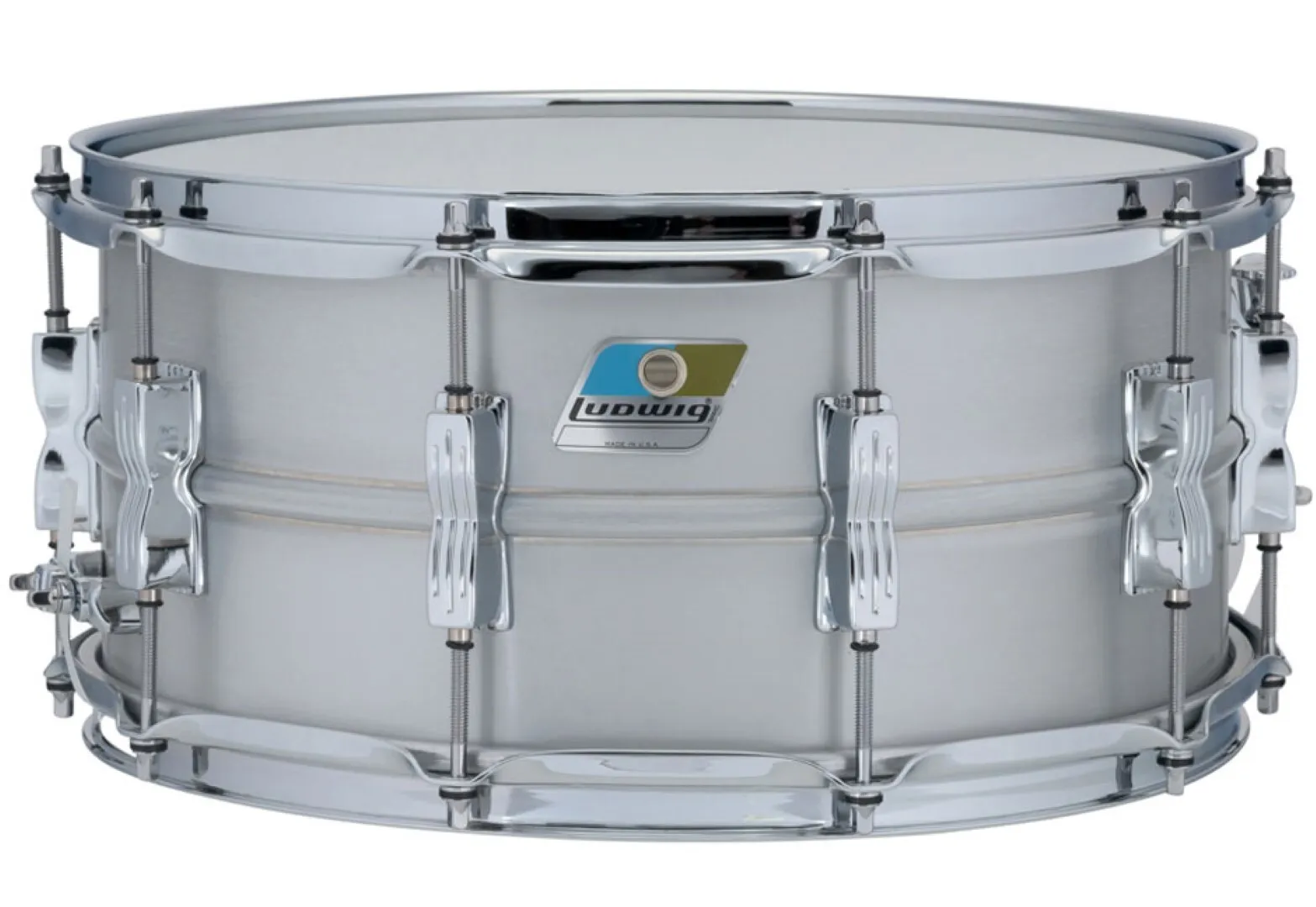 Originally introduced in 1963 as a student drum, the Ludwig Acrolite quickly became the choice of pro players in need of dry, cracking snare tone. Ludwig has re-introduced the Acrolite in its original splendour; with a seamless, beaded, brushed-aluminium shell. Made in Monroe, North Carolina, USA, the Acrolite features chrome Classic dual snare lugs, P85 strainer, and Blue/Olive Badge.