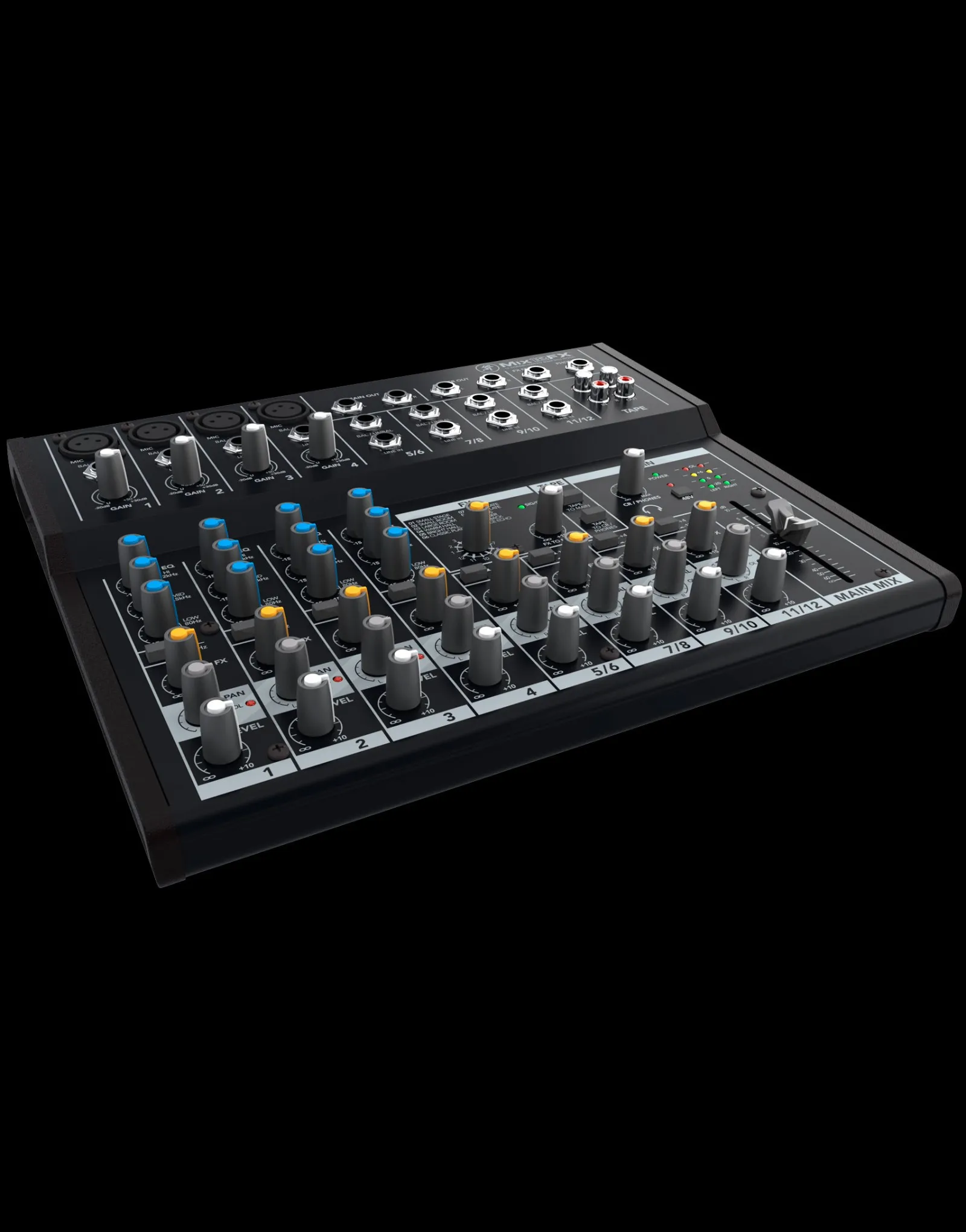 The Mix12FX offers a clean, streamlined way to shape vocals, instruments and playback sources without the bulk of a larger console. Its four mic/line inputs feature low-noise preamps, low-cut filters and a 3-band EQ, giving you precise control over clarity and tone for small performances, rehearsals or home recording. The additional stereo channels make it easy to integrate keyboards, drum machines or external audio devices, while the onboard FX engine provides twelve useful effects—including reverbs, delays and choruses—to add space and colour to your mix. With dedicated RCA connections for playback or recording, a smooth 60mm main fader and separate headphone and control room outputs, the Mix12FX adapts comfortably to compact studio setups or portable live rigs. Rugged construction ensures it stands up to consistent use.