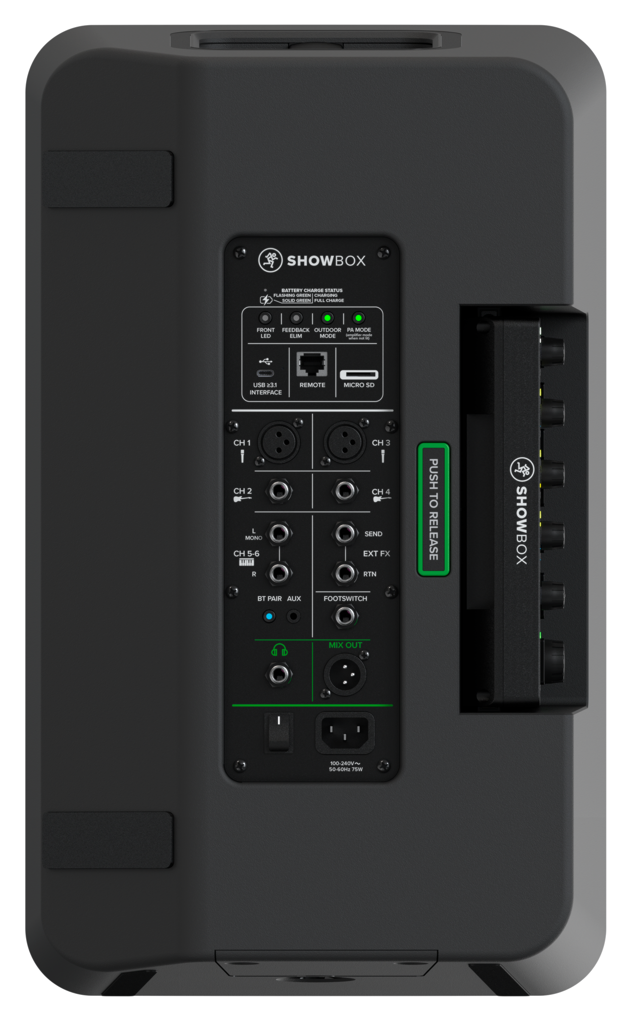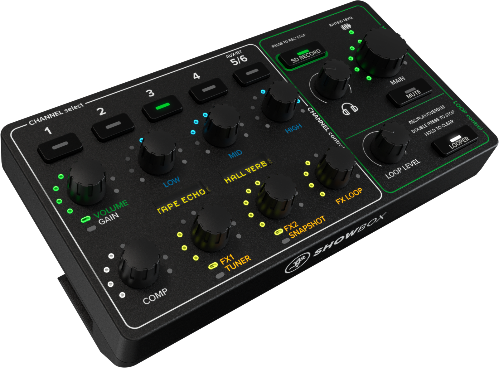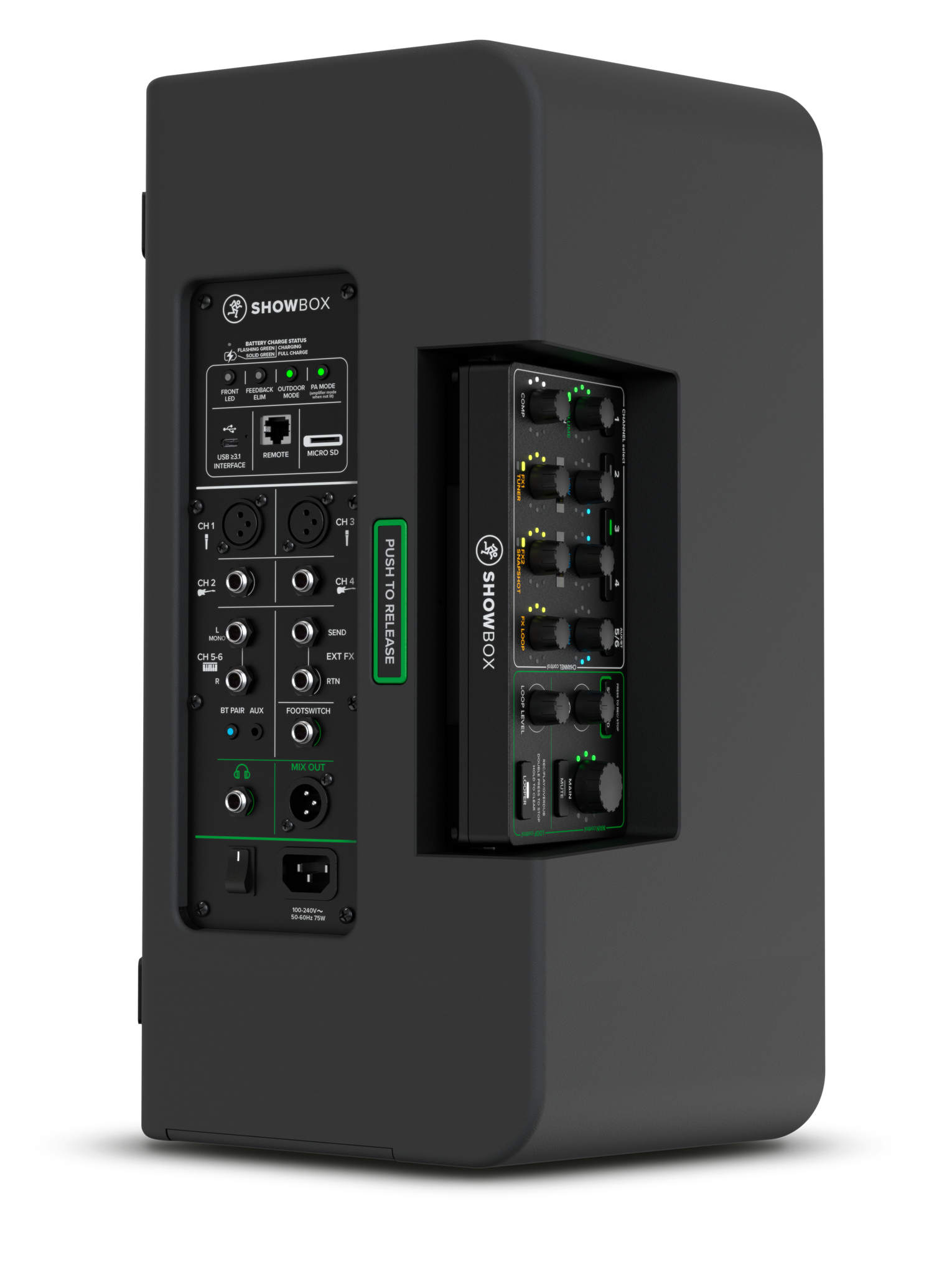 The Mackie ShowBox is a fully featured, battery-powered performance system that replaces your PA, acoustic amp, mixer and effects rack in a single compact unit. Its 400W amplifier, custom 8-inch driver and included rechargeable battery deliver up to 12 hours of powerful sound for street performances, solo gigs, rehearsals and small shows. With six input channels, built-in effects, indoor/outdoor voicing modes and switchable PA or amp voices, it’s designed for singers, guitarists and multi-instrumental performers who want great sound anywhere.