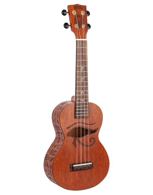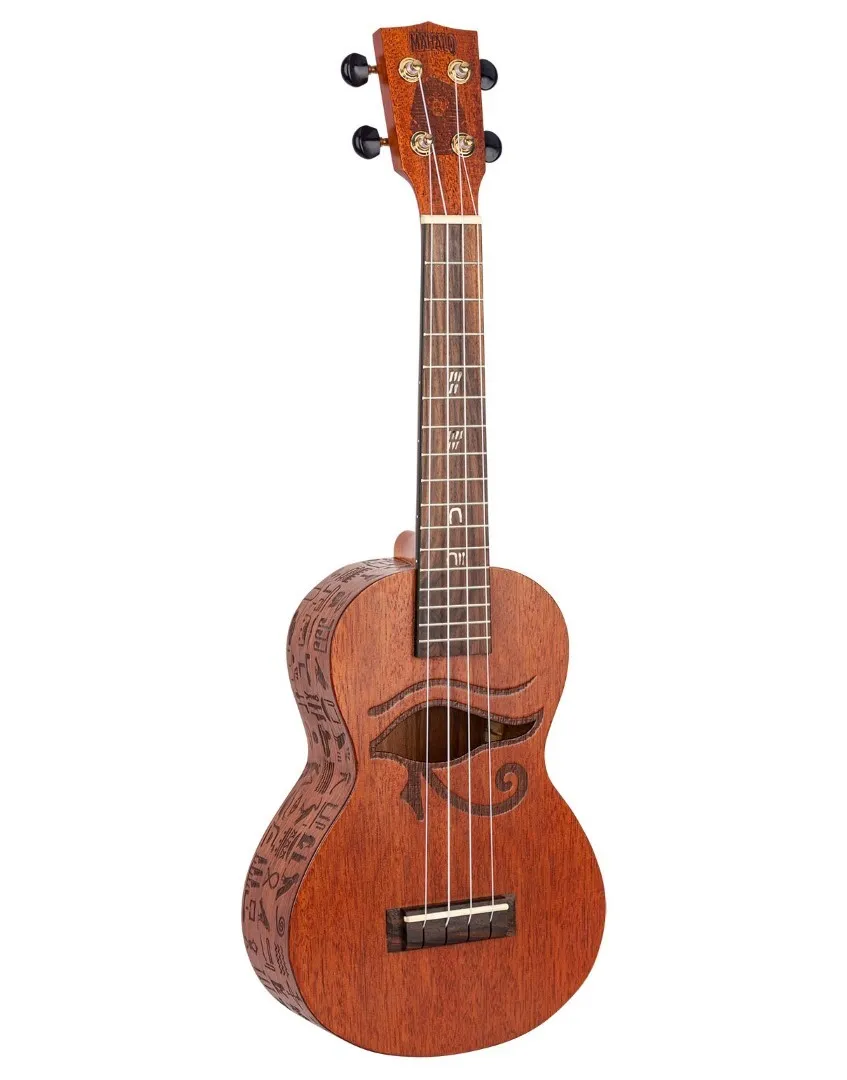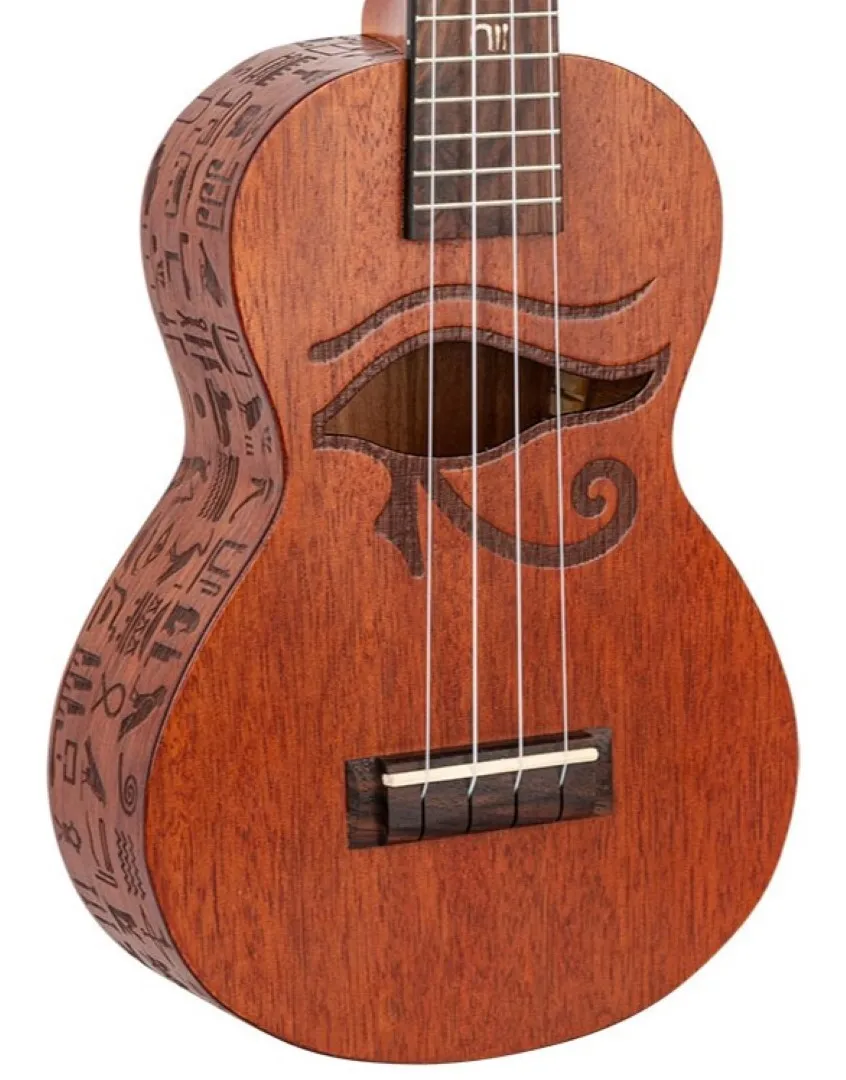 The Mahalo Artist Elite "Pharoah" Concert Ukulele raises the bar in terms of playability, looks and features at an entry level price point. A Nato body with stunning graphic art design, coupled with a Mahogany neck and Amara Ebony fingerboard & bridge makes for an instrument that looks and plays like one at ten times the price. The Pharoah features Laser Etched Hieroglyphics on the back & side, a unique Eye of Ra soundhole design, and highly detailed Egyptian number pearloid inlays.
