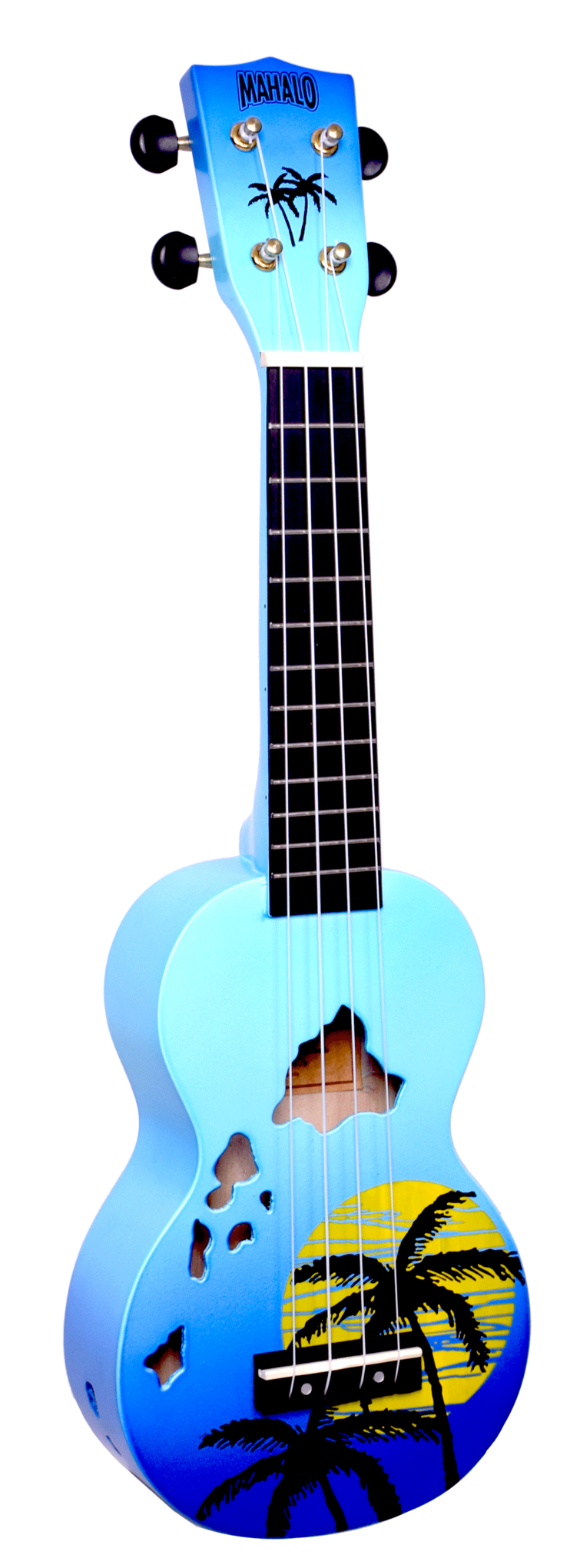 The Mahalo Designer Series features a number of fun, original designs, such as this ukulele, which has a soundhole in the shape of the Hawaiian islands.