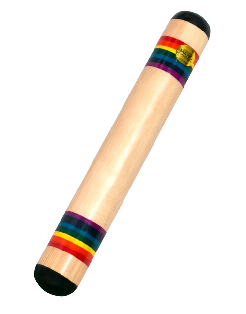 Wooden rainmaker. Wooden cylinder filled with beads that roll back and forth to create a rain sound. 14" long with painted rainbow rings at either end.