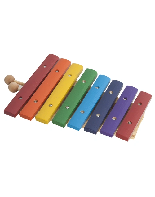 The Mano Coloured Xylophone is an 8-note xylophone (Diatonic C6-C7). It features handcrafted solid wood with colour coded bars, and a wooden frame and beaters.