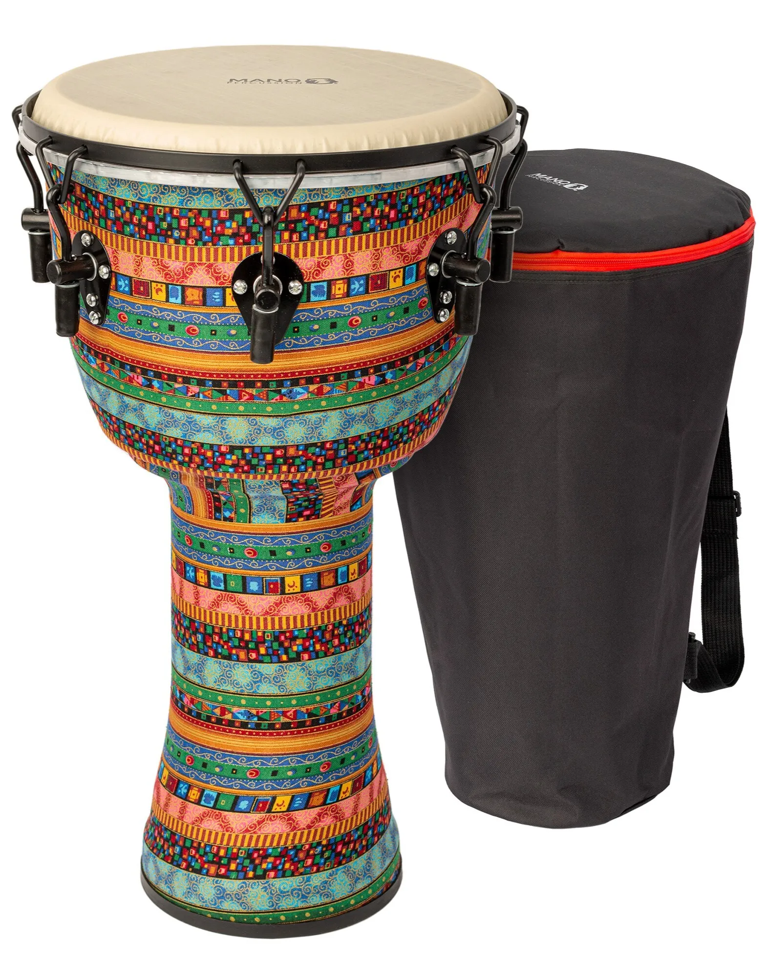 Introducing the Mano Percussion MPC11WS 12" ABS Djembe Water Spirit - a lightweight 12" wrench tunable djembe featuring a durable ABS shell with a cloth wrap, 7 tunable hook lugs, a rubber base strip for added protection, and a 23¾" height. It also comes with a black cloth bag with backpack straps and a tuning wrench, making it easy to transport and tune on the go. The water spirit design is sure to turn heads.