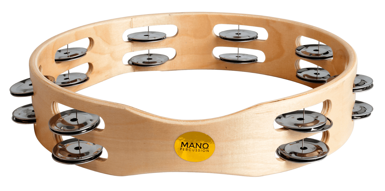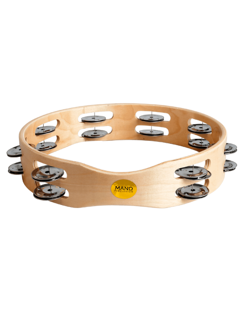 The Mano Wooden Handheld Tambourine 2 Rows of Nickel Jingles is a 10" Wood rim tambourine with 16 pairs of nickel silver jingles in double row.