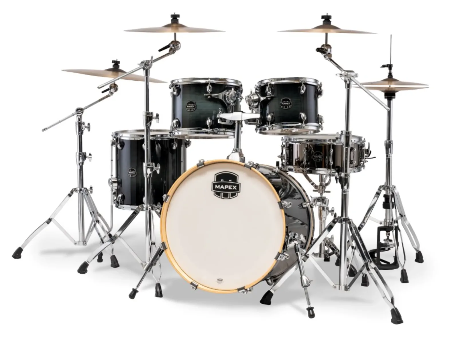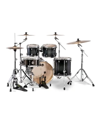 The Mapex AR504SV Armory Fusion Shell Pack delivers dynamic tone, projection and style, thanks to its hybrid 8-ply Birch/Maple/Birch shells. The SONIClear bearing edges and suspension system enhance resonance and tuning ease, while the stunning Olive Wood veneer ensures serious stage appeal. This kit features a compact 20" kick and 14" floor tom for focused, punchy response. It includes the powerful TOMAHAWK 14" x 5.5" steel snare, known for its sharp rimshots and projection. Other pro-grade features include a TH676 double tom holder, insulated bass drum claws, and 2.3mm power hoops.