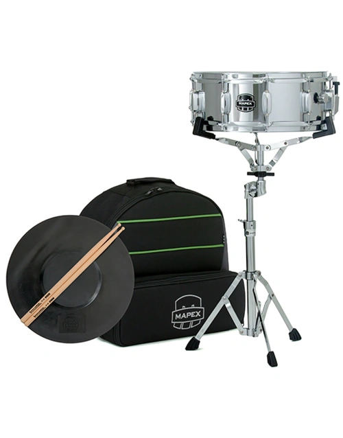 14" x 5" ten lug chrome snare, practice pad, adjustable stand, Innovative Percussion IP-HB sticks. Backpack provides easy mobility. Adjustable stand offers convenience. Practice pad provides a more quiet option.