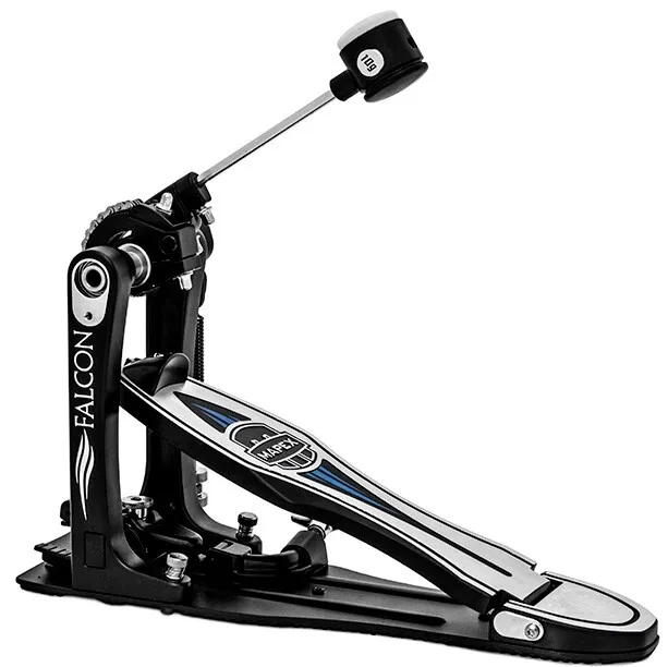 The Falcon design was influenced and road tested by a team of artists who want an incredibly smooth feel and simple adjustability. The settings are dialled-in at the factory, so it feels good right out of the bag with only minor adjustments needed to fit individual tastes. That means more time playing and less time adjusting. The interchangeable drives (sold separately part # ACF-DD, and ACF-SD) allow players to purchase only one pedal, but still have the freedom to experiment with the differences between chain, strap, and direct drive feels. It also enables double-pedal players to use different drives for each pedal to balance the feel between the left and right feet. The interchangeable beater weights, variable footboard height, and adjustable beater angle allow for simple and fine adjustment of torque and power. The smaller size of the base-plate makes it easy to position a double-pedal around snare stand legs and closer to the hi-hat pedal.