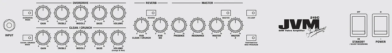 Take your sound from the stage to the studio with the flick of a switch. With the JVM in silent recording mode, you can hook up to an interface or mixing desk to capture that perfect take. JVM amps feature two effects loops for connecting a host of effects pedals and other external gear. The first loop is adjustable to let you perfectly blend your effects and original tone together. JVM amps can also receive and repeat MIDI commands for ultimate control and synchronising with the rest of your setup. Two master volumes mean you can get an instant volume boost when it’s time for your big moment. You can recall your mode, master and reverb options with the programmable footswitch (included), giving you power and flexibility exactly when and where you need it.