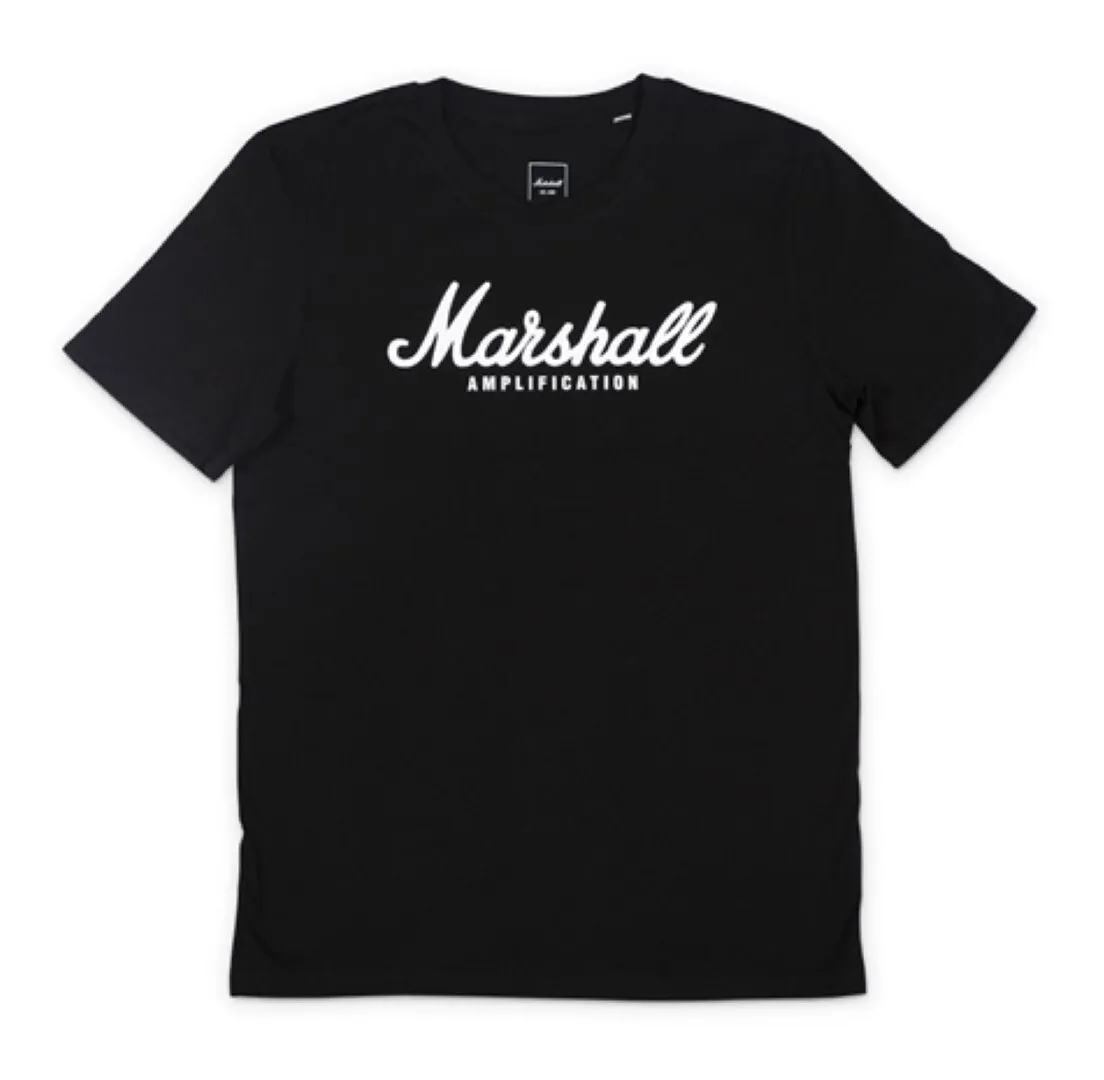 Marshall script logo T Shirt, Black with white print. Organic Cotton. Short sleeve. Size Extra Large