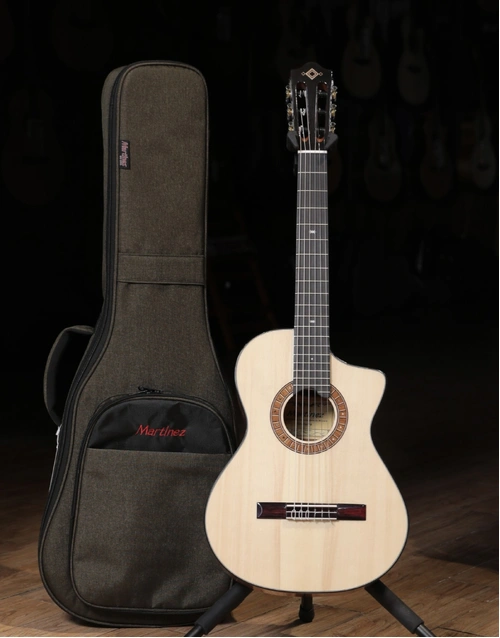 The Martinez M-POP Standard Series Solid Top 3/4 Size Classical Nylon String Acoustic Guitar is a practical choice for younger players, travellers or anyone wanting a more compact nylon-string acoustic. Its 580mm scale length gives it an easy, comfortable feel, while the solid spruce top helps deliver a clear, lively response with more depth than you might expect from a smaller body. Sapele back and sides add warmth and balance, with a purple heart fingerboard and Santos rosewood bridge rounding out the build. The included gig bag makes it easy to take to lessons, school or casual playing on the go.
