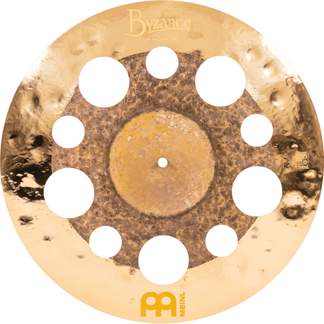 The Meinl BDU-B18DUTRC Byzance Dual 18" Dual Trash Crash features a stunning contrast of extra dry and brilliant finishes with a unique combination of hammering and lathing. This thin cymbal with added holes explodes with a fast crash and has very short sustain, making it a great cymbal for quick or trashy accents.