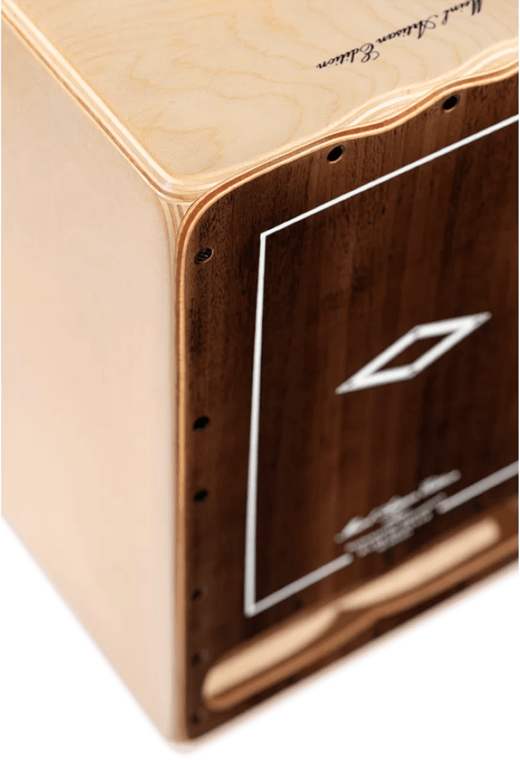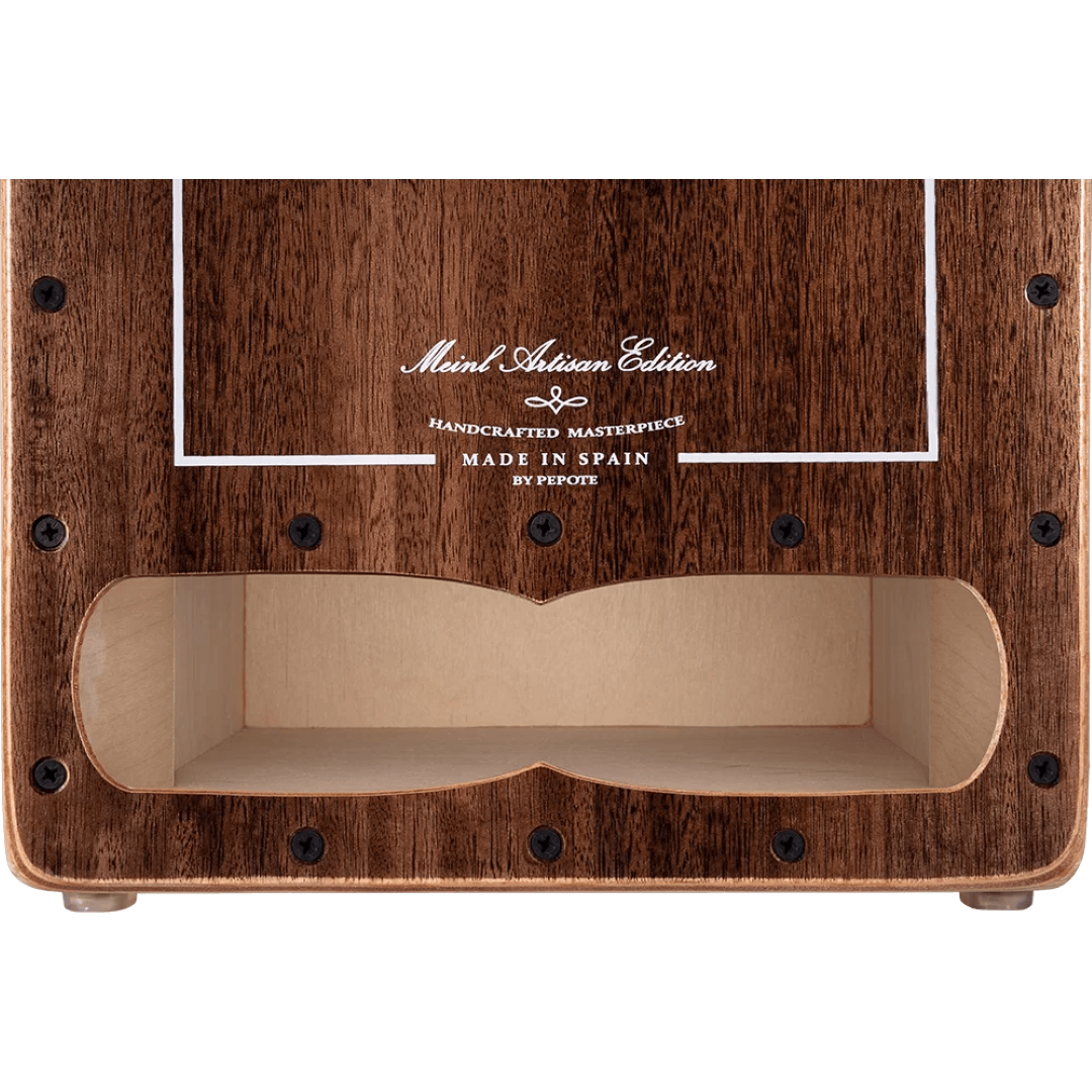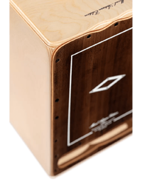 Presenting the Meinl CJ-AECLBE Artisan Cajon Cantina Line in a striking Brown Eucalyptus design. This cajon offers a wide dynamic range, with two sets of six hand-wound micro-coiled metal cajon strings producing a sharp snare effect. The 7-ply, 9 mm thick Baltic Birch resonating body delivers a full, punchy tone with enhanced bass notes through the front soundhole. Its elegant decorations complement its impressive appearance. Crafted in Spain, with hand-wound strings crafted according to the expertise of master cajon builder, José "Pepote" Hernández Diaz.