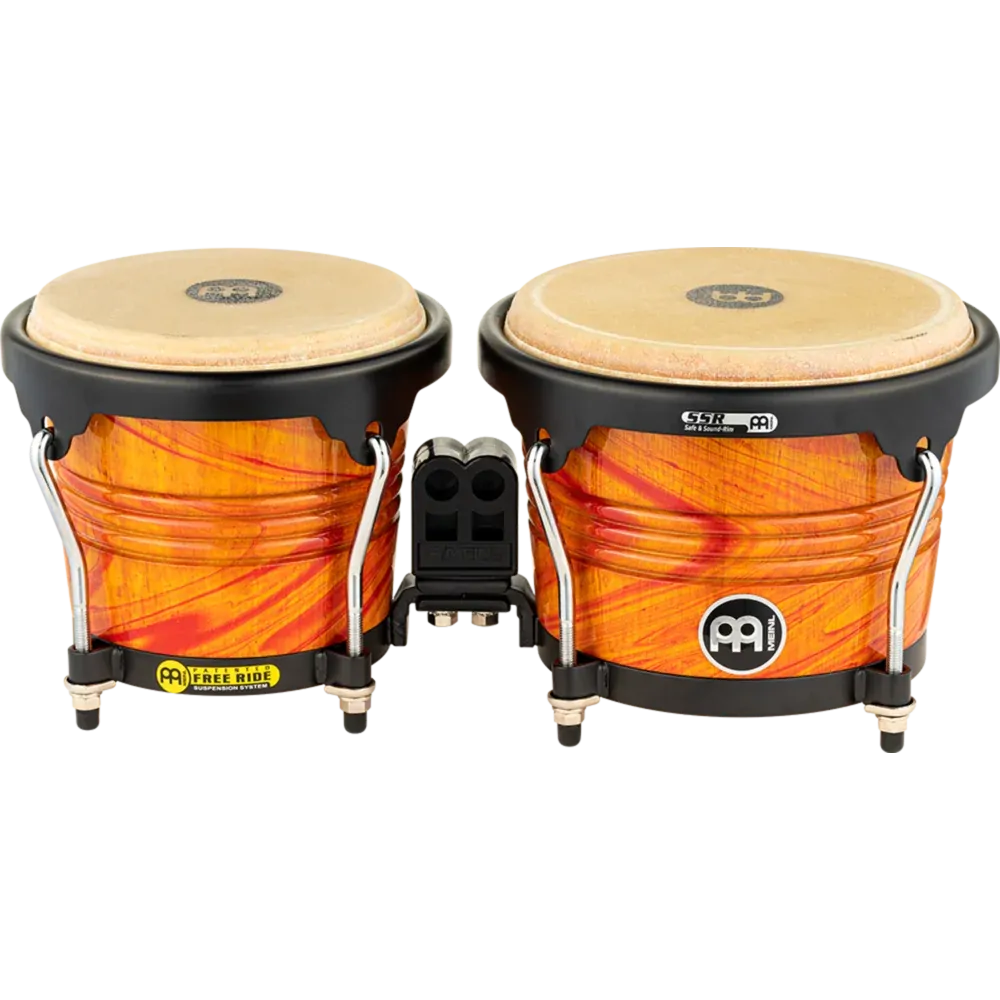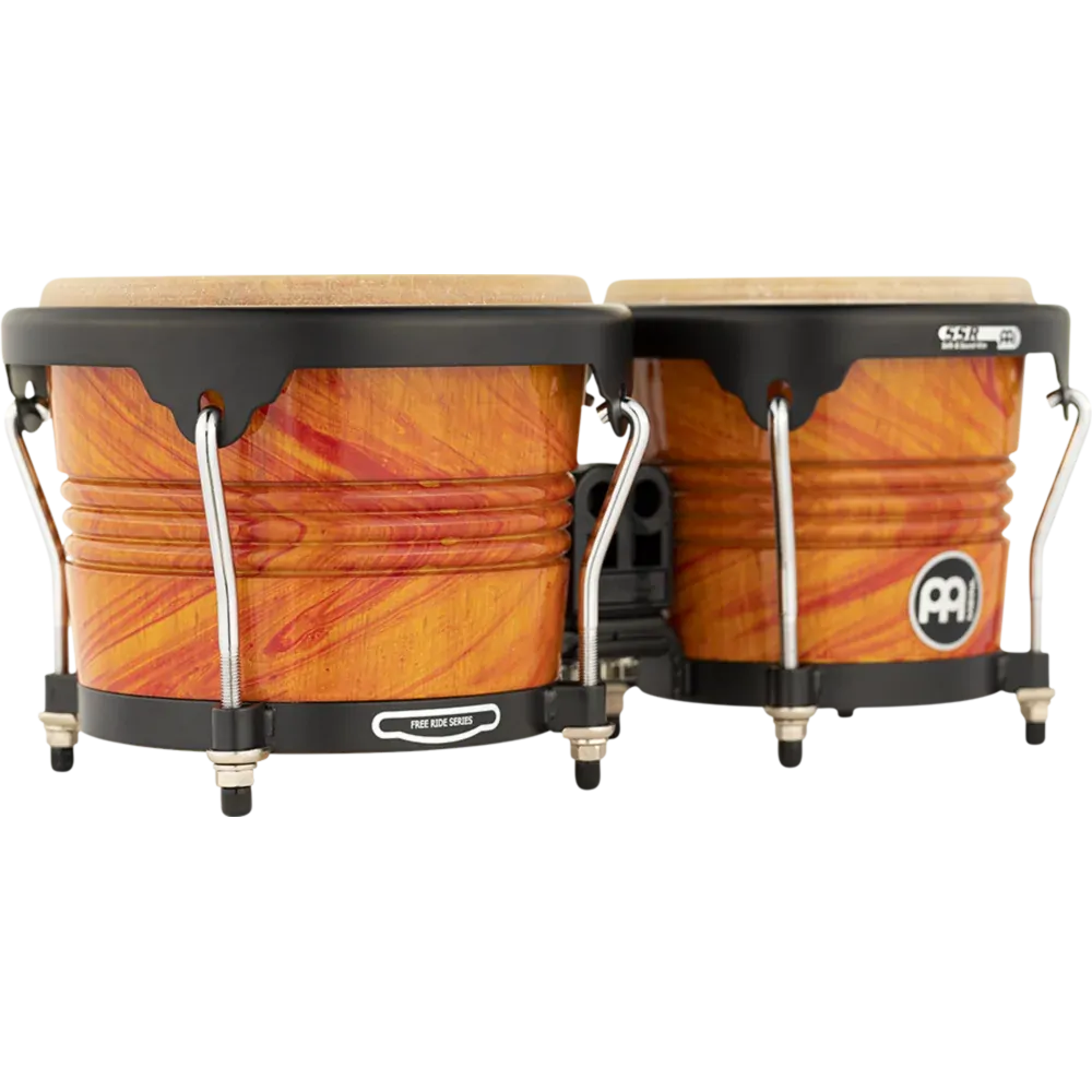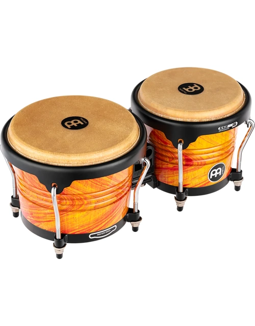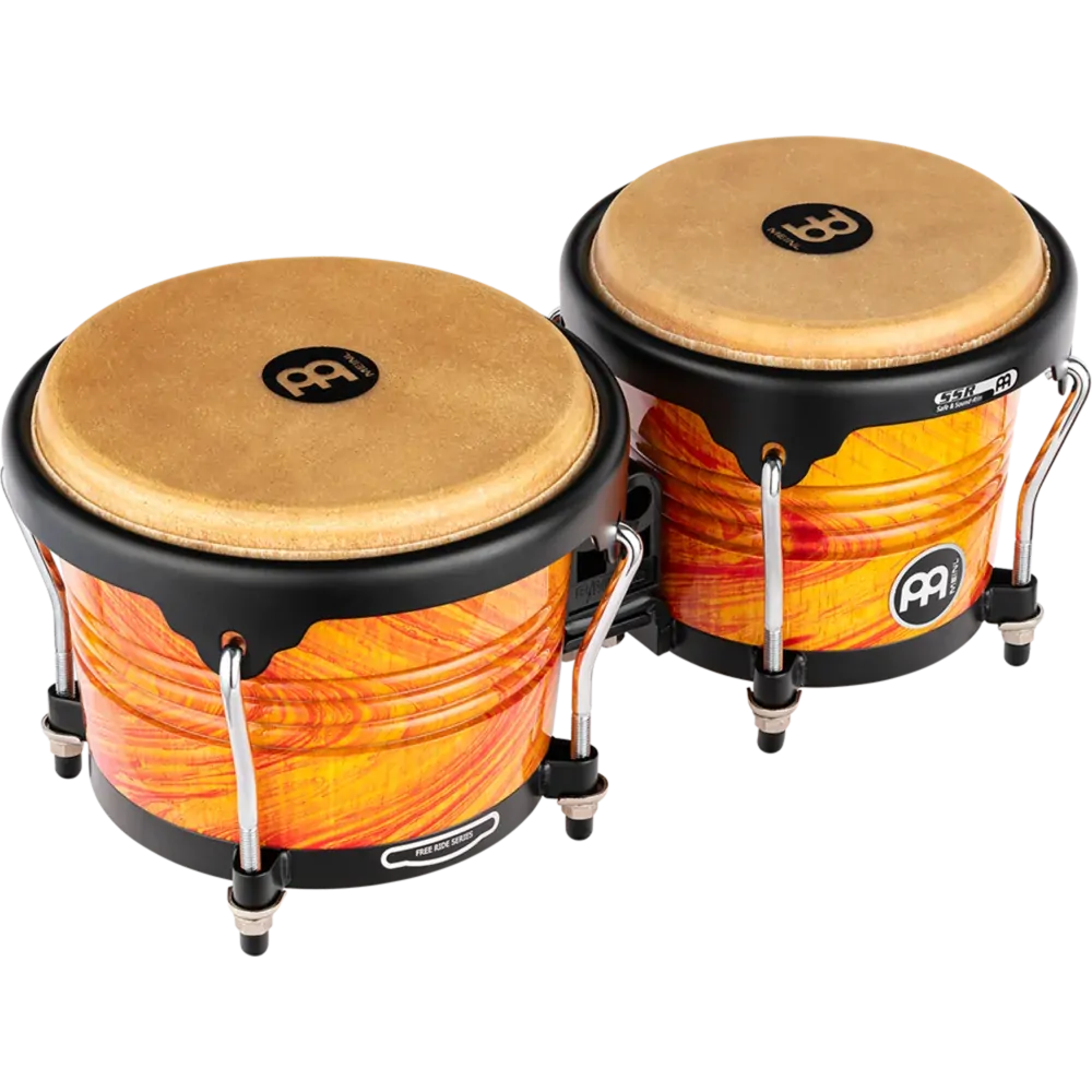 The Meinl Marathon Designer Series Wood Bongo in Amber Flame combines rich acoustic tone with standout visual appeal. Crafted from Siam oak and fitted with hand-selected buffalo heads, these 6.75" and 8" bongos deliver warm, resonant projection suitable for studio, stage or traditional ensemble playing. The Free Ride Suspension System allows both drums to resonate freely, enhancing sustain and clarity while maintaining tuning stability.