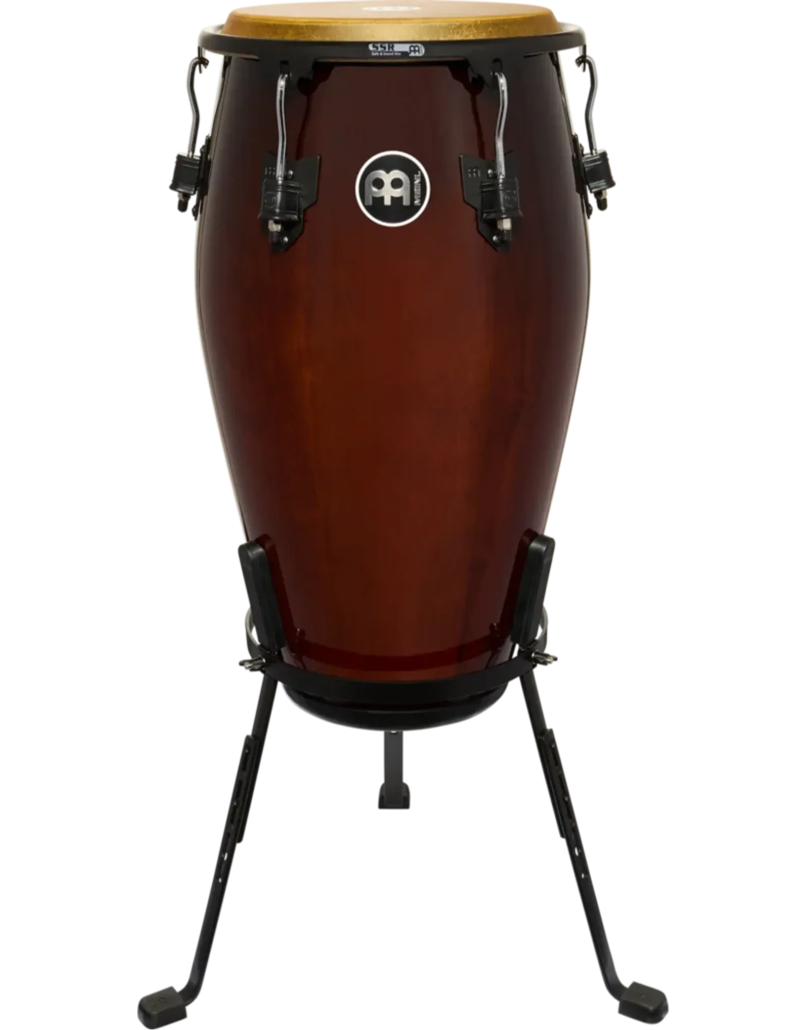 Meinl’s Steely-II stand system features an L-shaped leg design with metal spike attachments for improved stability during performance. Ergonomic rubber bracing helps isolate the drum from floor vibration, while height adjustment notches allow quick setup changes to suit different playing positions.