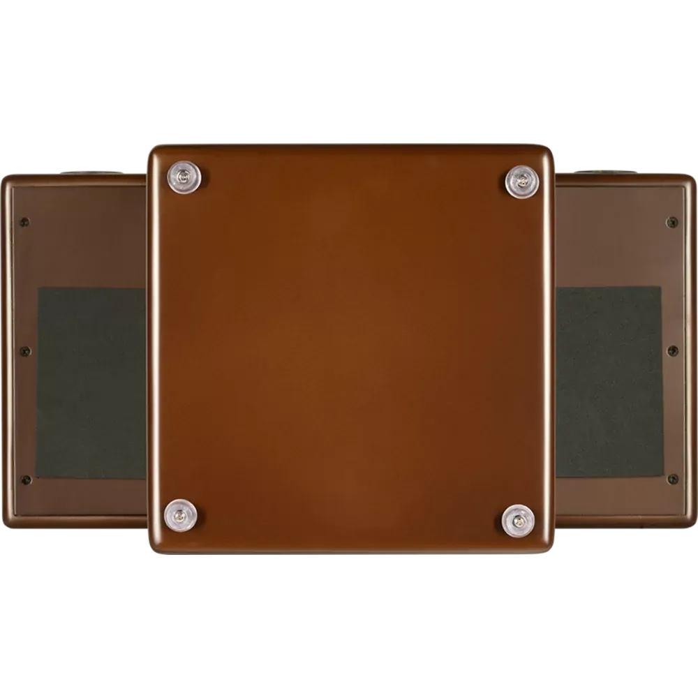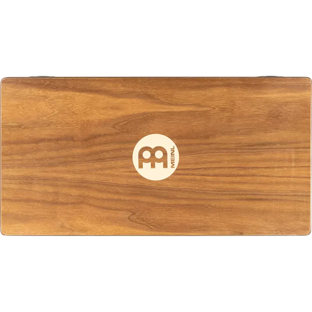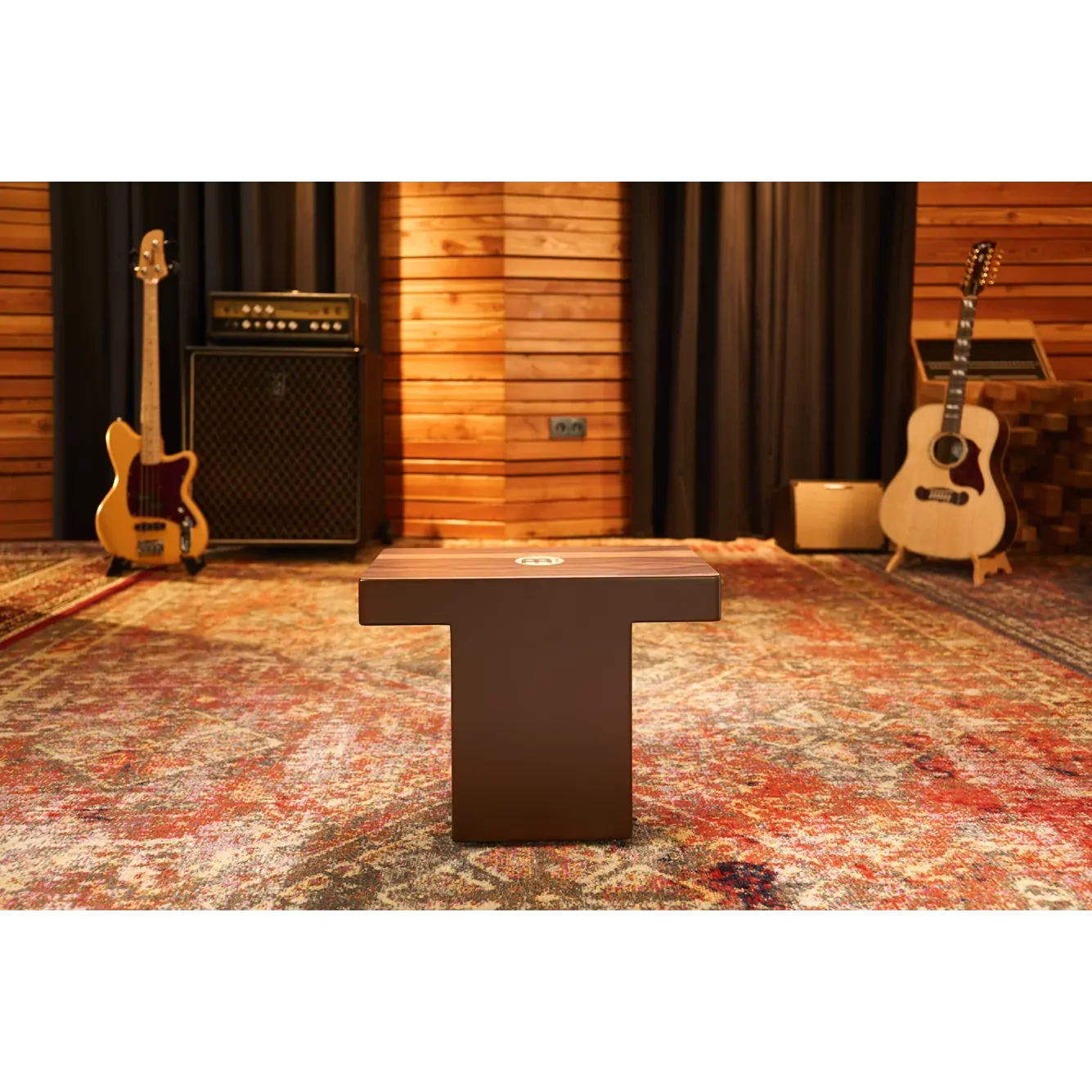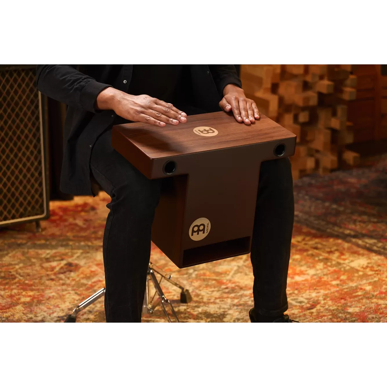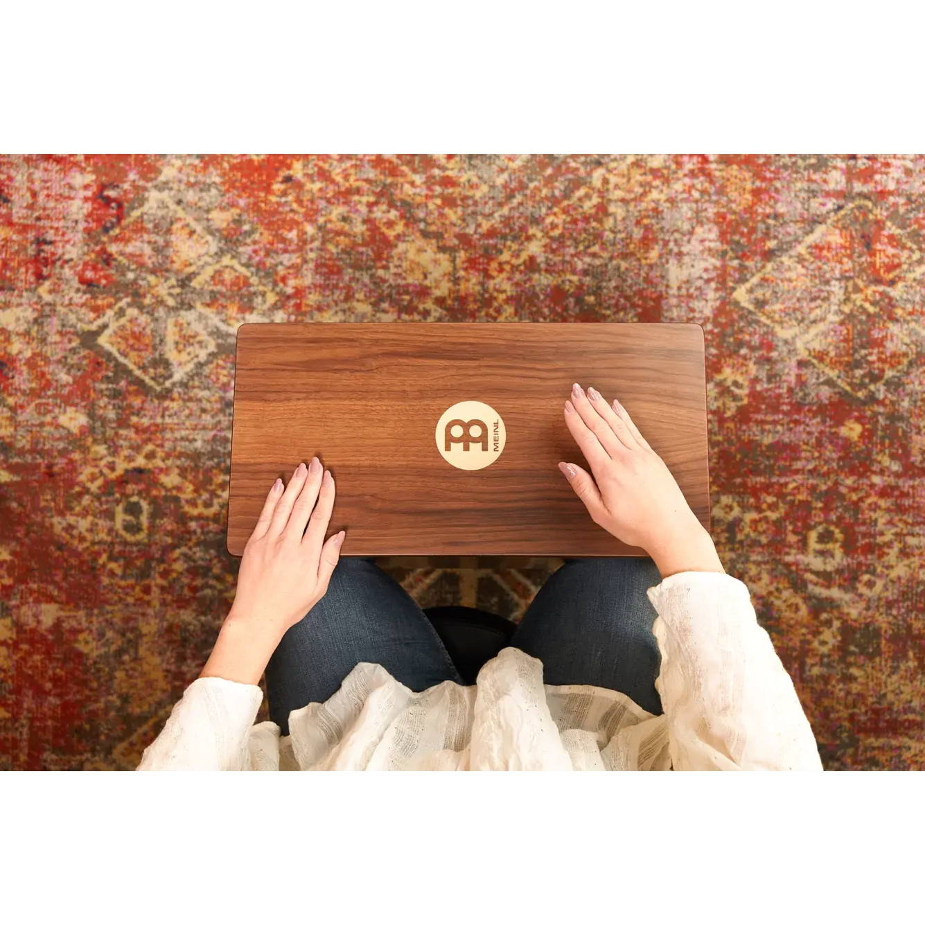 The Meinl TOPCAJ2WN Turbo Slaptop Cajon brings the playing surface up toward the performer, creating a natural upright position that’s easy on the body during longer sessions. The matte Walnut faceplate delivers a musical balance of deep bass and sharp slap tones, enhanced by three forward-facing sound ports that project your grooves directly to the audience. Its larger Turbo body increases overall volume, while dual internal snare wires on both sides provide tight, responsive articulation for pop, acoustic and world-music styles. Soft foam pads help the cajon sit comfortably on your lap, and silicone feet keep it stable on the floor when used in a standing setup. Built from eco-friendly MDF with a Walnut top, it offers consistent tone and solid durability.