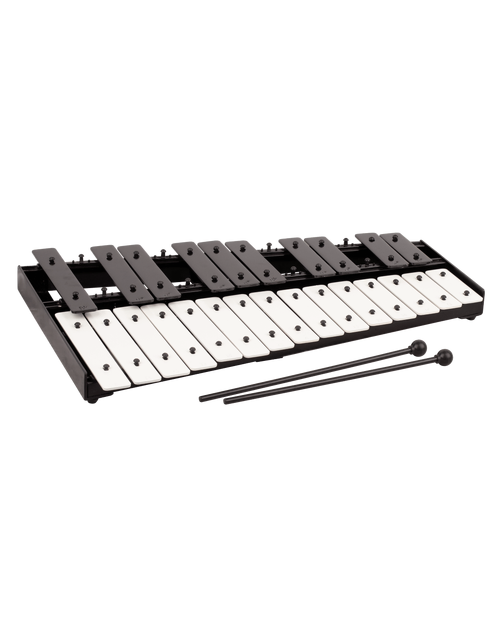 Chromatic 25 note glockenspiel. Steel black and white painted bars mounted on black plastic frame to reduce weight. A4-A6 Note Range. 50.5cm (L) x 34.5cm (W) x 4.8cm (D)